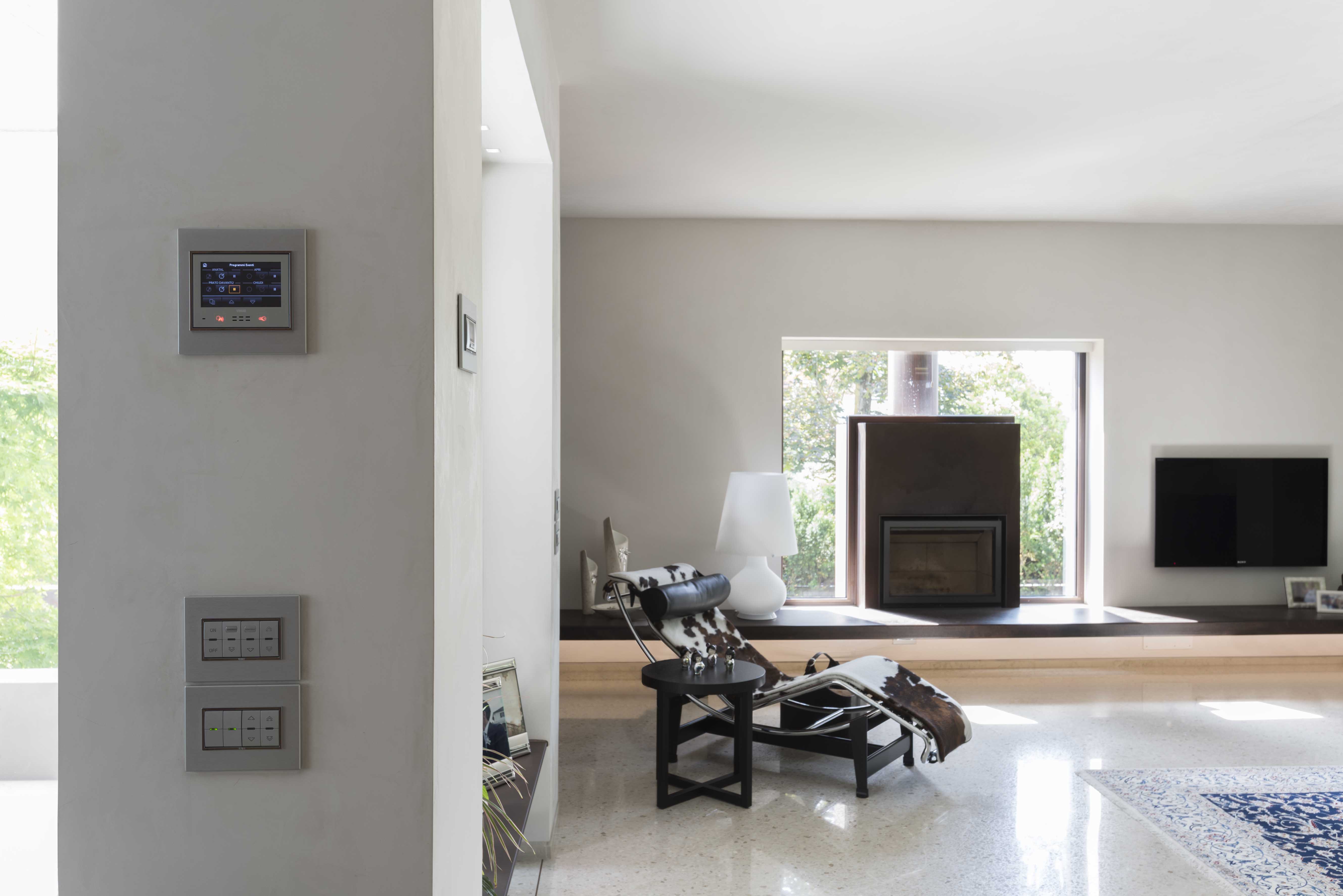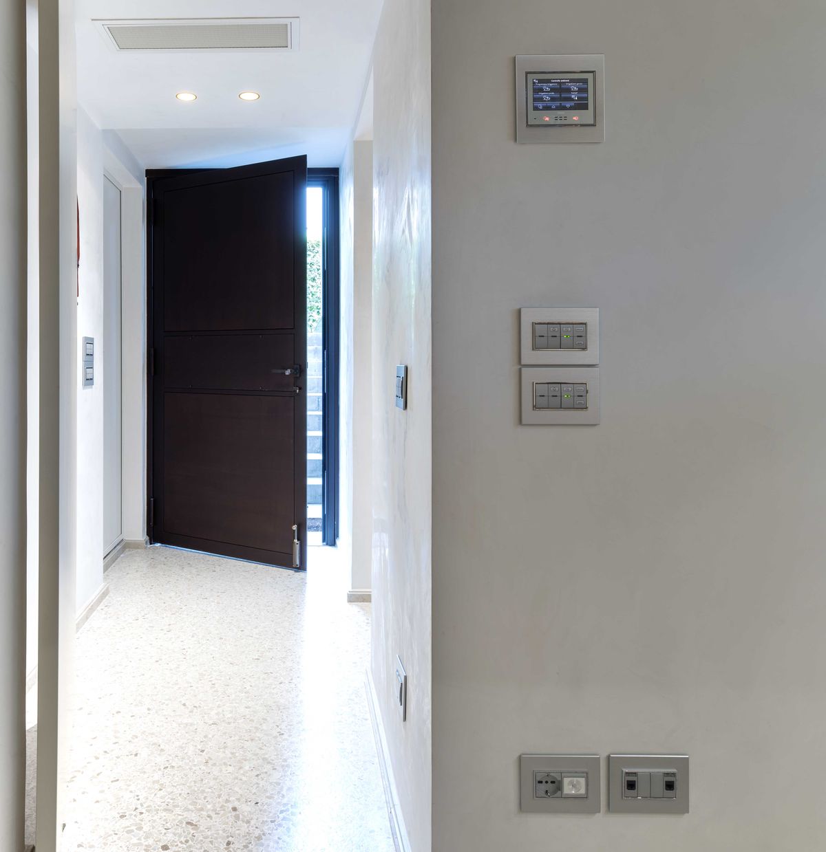 Sistema domotico. Un dialogo intelligente con la casa reso possibile grazie alla tecnologia sofisticata quanto semplice da utilizzare del sistema domotico By-me. Localmente tramite i comandi presenti in ogni stanza e centralmente attraverso i video touch screen da 4,3 pollici installati. Da questi pannelli di controllo possono essere infatti gestite tutte le funzioni domotiche: