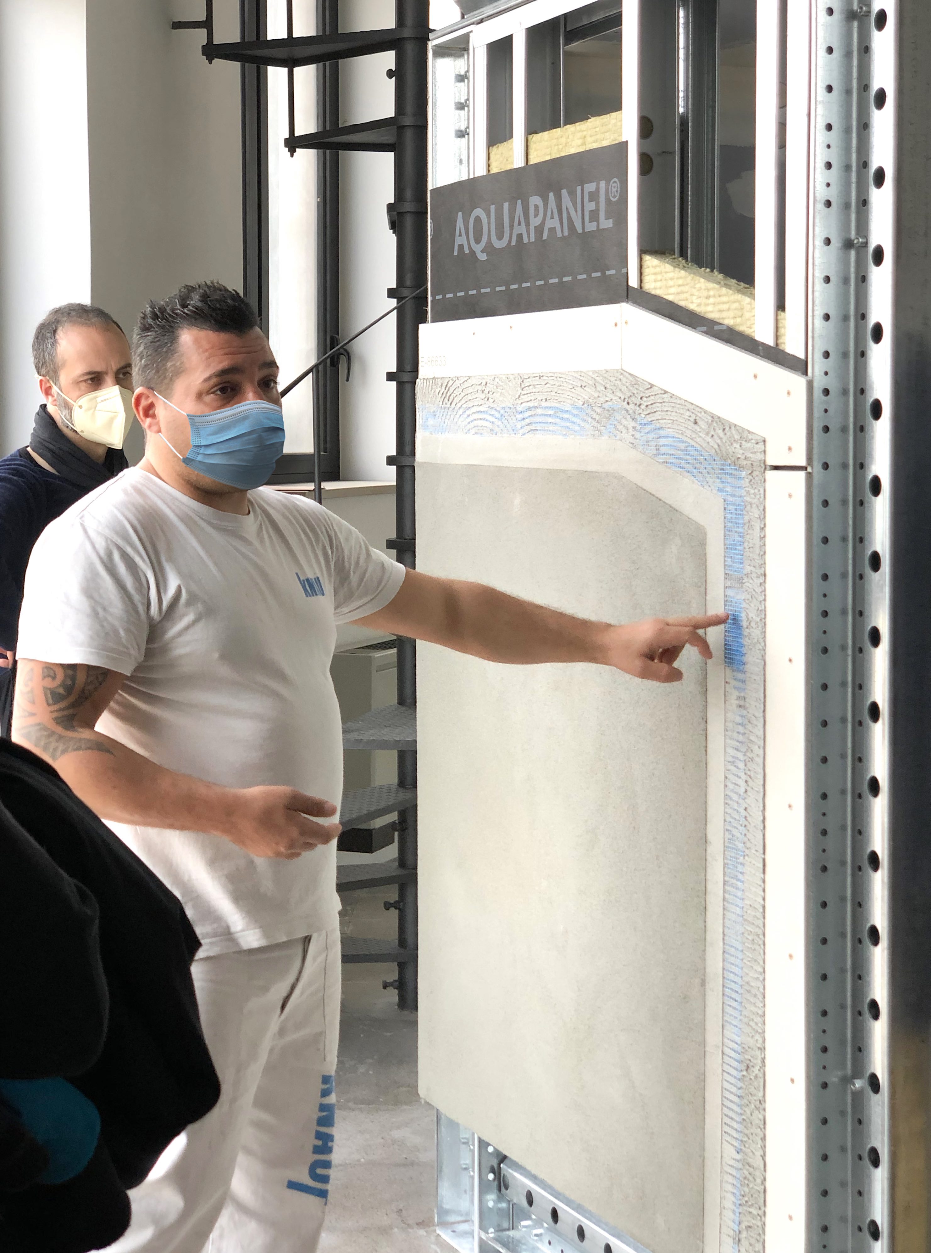 Conclusa la formazione e il confronto con architetti e ingegneri, l’istruttore tecnico di Aquapanel Arcangelo Michele Lamberti, ha proseguito con un’interessante dimostrazione su come vengono applicati gli strati che compongono l’involucro Knauf.
