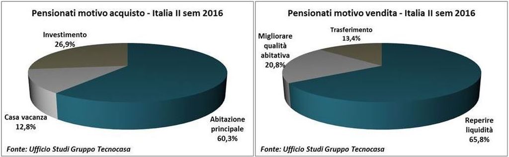 L’analisi delle compravendite realizzate attraverso le agenzie affiliate Tecnocasa e Tecnorete sul territorio nazionale nel secondo semestre del 2016 evidenzia che il 9,0% degli acquisti è stato effettuato da soggetti in pensione. Rispetto ad un anno fa (secondo semestre 2015) non si registrano variazioni significative della percentuale di acquisto da parte di pensionati, si passa infatti dal 9,3% al 9,0% attuale. I pensionati nel 60,3% dei casi hanno comprato l’abitazione principale, nel 26,9% dei casi hanno comprato per investimento ed infine il 12,8% degli acquisti ha riguardato la casa vacanza. Rispetto ad un anno fa aumenta la percentuale di acquisti per investimento (+1,4%).