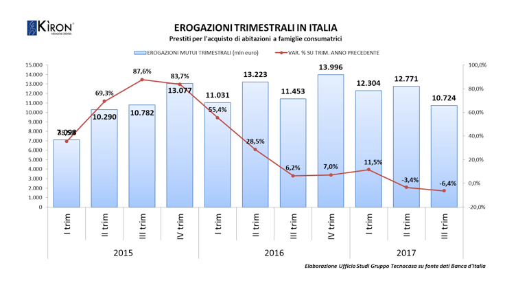 Secondo i dati diffusi da Banca Italia nel terzo trimestre del 2017 il mercato immobiliare è stato caratterizzato da una diminuzione del 6,4% dell’erogazione dei mutui rispetto allo stesso periodo del 2016, una percentuale corrispondente a – 729 milioni di euro.