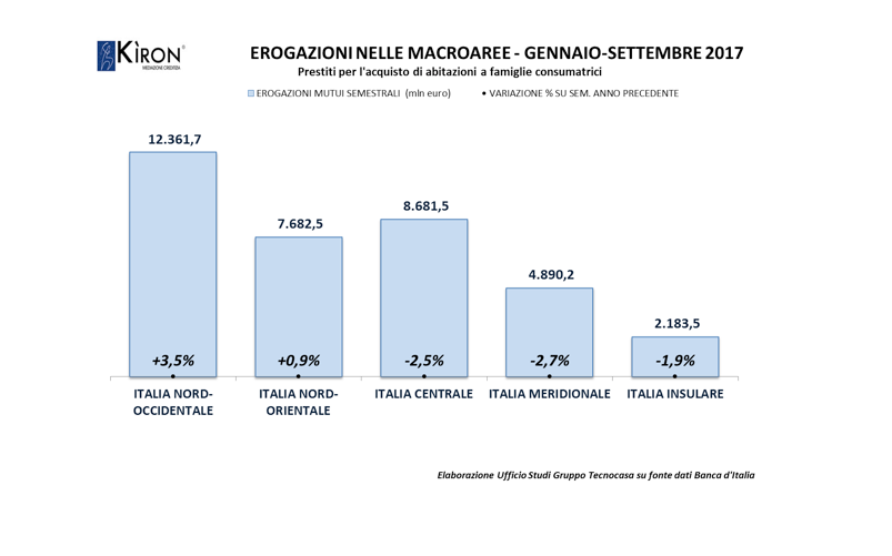 L’analisi dei dati per macroarea rileva come il calo sia più accentuato nelle aree del Nord Est, del Centro e delle Isole, mentre risulta più contenuto al Sud Italia e nel Nord Ovest. Nonostante l’andamento del terzo trimestre, analizzando i dati cumulativi dei primi nove mesi del 2017, le macroaree del Nord permangono in crescita rispetto al pari periodo del 2016, mentre Centro, Sud e Isole virano in territorio negativo anche nel saldo di periodo. Nel terzo trimestre 2017 crescono Abruzzo e Lombardia; quest’ultima, oltre a far registrare una crescita (+1,5%), con i suoi 2.617 milioni di euro di mutui erogati si conferma la prima per volumi in Italia anche nel terzo trimestre dell’anno.