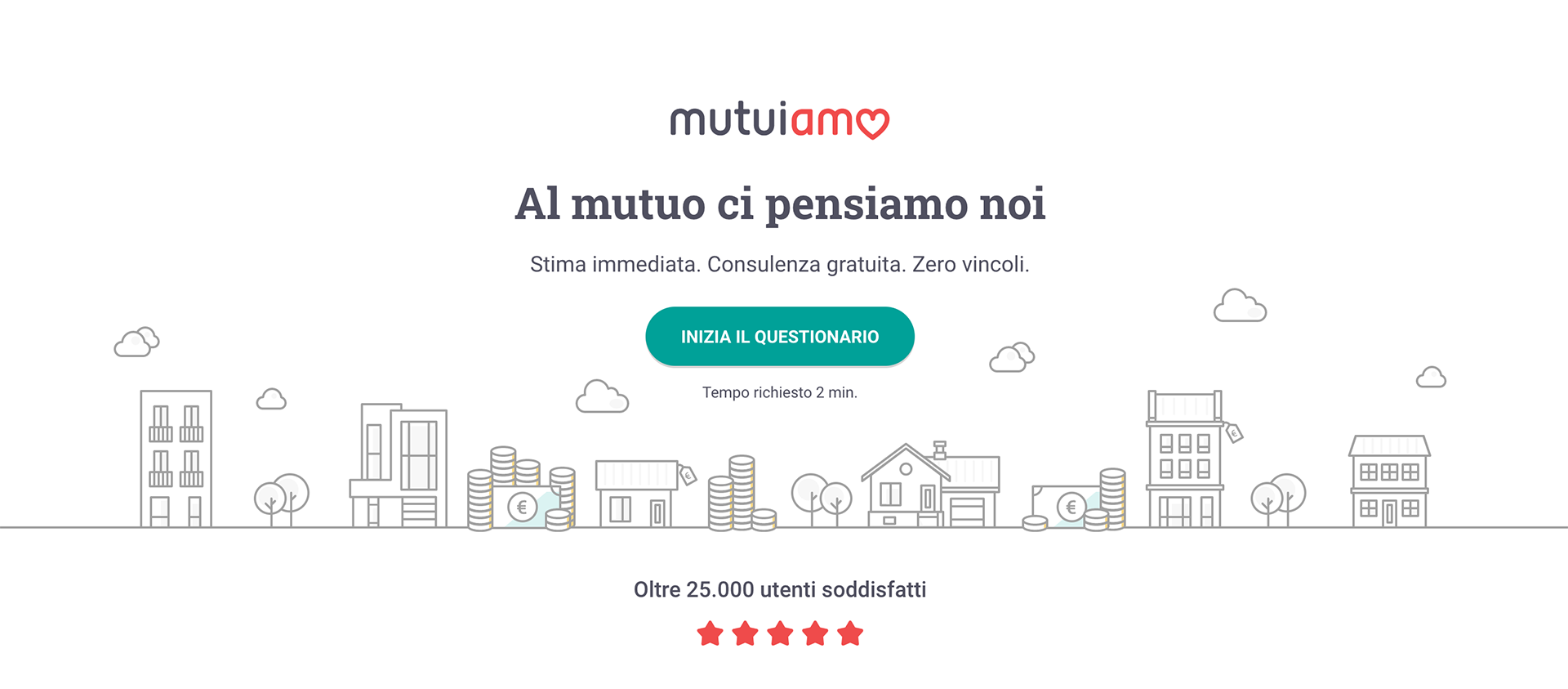 Su Mutuiamo è possibile compilare in pochi passaggi un semplice questionario e successivamente si riceve una consulenza gratuita a distanza da parte di un Credit Advisor, che analizza le esigenze di ogni utente e lo supporta nella scelta del finanziamento più adatto alla sua situazione, fornendo la stima della rata del mutuo dopo aver verificato la sostenibilità dell’operazione.