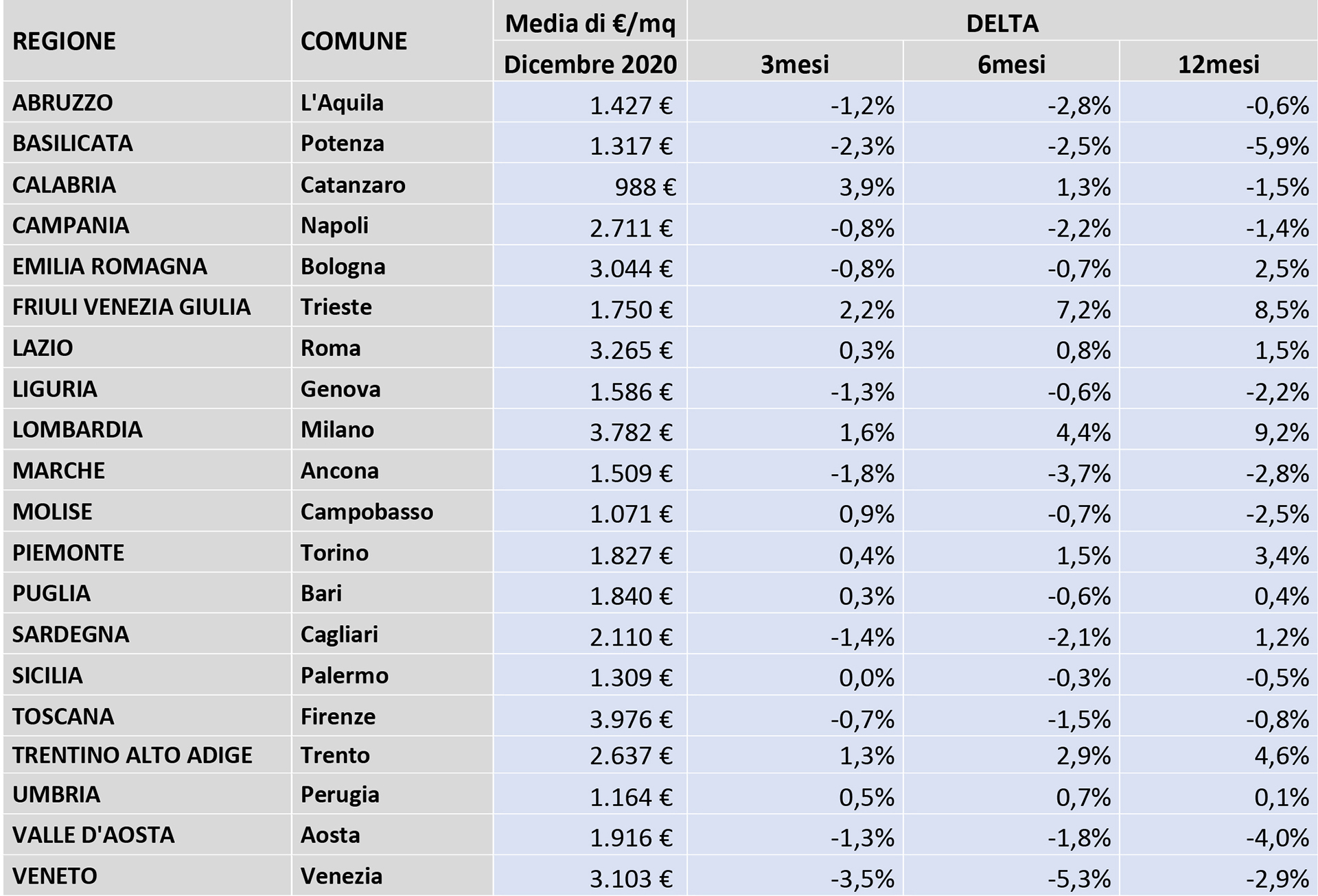 Guardando al dettaglio relativo ai capoluoghi di regione, il più caro di tutti, Firenze (3.976 euro/mq), chiude il 2020 in sofferenza: qui i prezzi delle case in vendita sono scesi dello 0,8% in un anno.