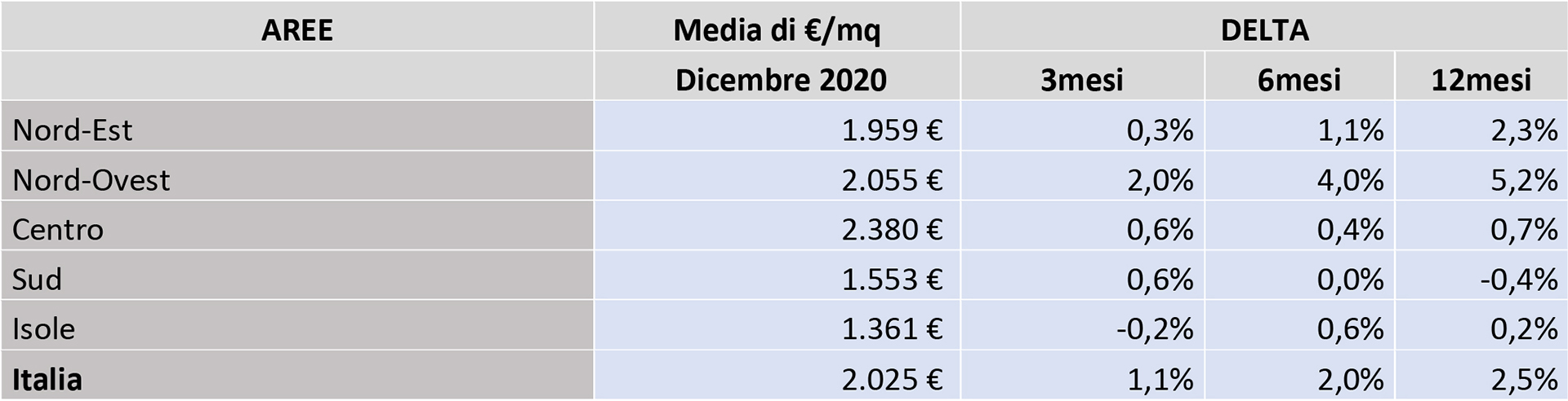 Secondo i dati di Immobiliare.it, nonostante leggere flessioni registrate nell’ultimo trimestre, l’anno 2020 si è concluso con prezzi in aumento del 2% su base annuale. A dicembre la cifra media richiesta per l’acquisto di un’abitazione a livello nazionale è stata pari a 2.025 euro al metro quadro.