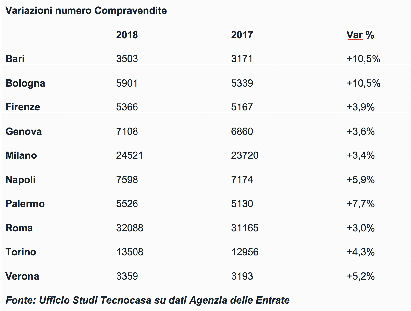 Nel 2018 le compravendite a livello nazionale nel comparto immobiliare residenziale sono aumentate del 6% rispetto all’anno prevedente, questo il dato dell’Agenzia delle Entrate. Nell’arco dello stesso anno, come rilevato dall’Ufficio Studi Gruppo Tecnocasa secondo i dati forniti dalle agenzie Tecnocasa e Tecnorete, nelle grandi città italiane non solo sono aumentate le transazioni, ma anche i prezzi, che hanno registrato un incremento dell’1,6%e le realtà più dinamiche, in termine di scambi, sono state Bari e Bologna, entrambe con un incremento del 10,5%.