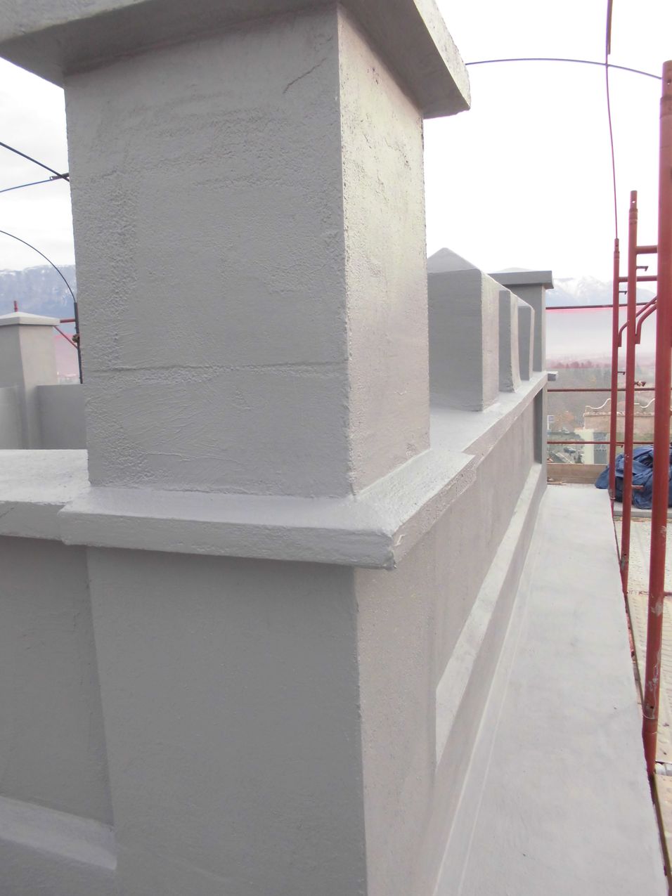 1. Pulizia e preparazione del sottofondo. Effettuata l’accurata pulizia del vecchio sottofondo così da rimuovere tutte le parti ammalorate non più solidali alla struttura in cemento mediante un’idonea attrezzatura, quindi pulizia generale delle superfici in cemento armato per eliminare polvere, lattime di cemento, patine superficiali incoerenti e ruggine. Rasatura delle pareti perimetrali in calcestruzzo sia interne che esterne della copertura del campanile. Realizzazione di nuovo massetto cementizio e realizzazione di idonee pendenze.