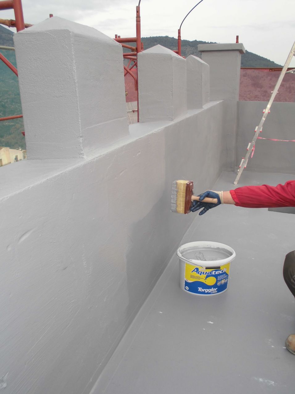 L’impermeabilizzazione è stata eseguita utilizzando il nuovo impermeabilizzante della linea Torggler Sitol Aquatech, una guaina liquida impermeabile monocomponente in emulsione acquosa resistente ai raggi Uv, ristagni di acqua, buona pedonabilità, elevata elasticità, direttamente piastrellabile e di facile applicazione, con l’ausilio di un primer Primer Aquatech aderisce anche su supporti critici come guaine bituminose e sottofondi metallici.