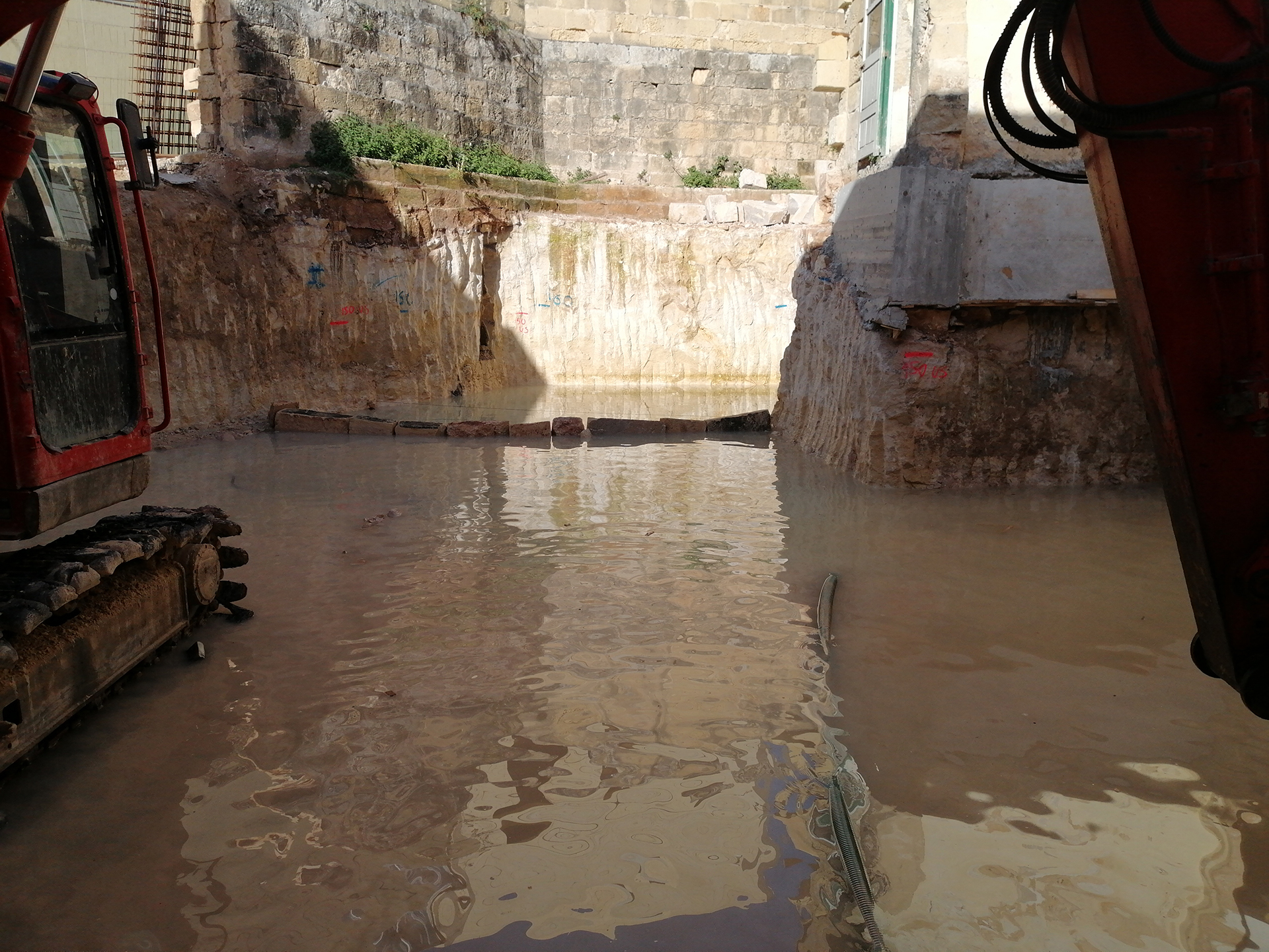 Non appena iniziati i lavori di smontaggio dei muri antichi e lo scavo in falda, si è subito manifestata la prima problematica: nonostante la relativa distanza dal mare dell’edificio è subito risultata evidente la presenza di acqua marina dalle fratture della roccia continua di globigerina, tipo “Zonqor”.