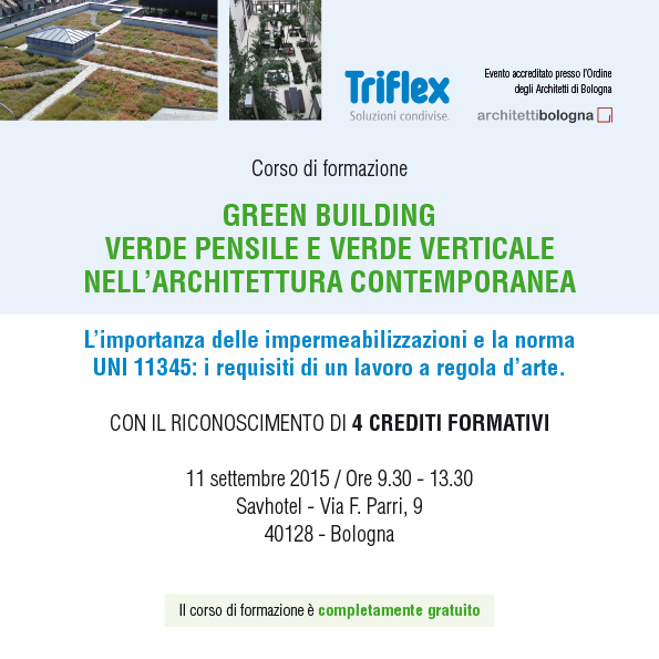 Il giorno 11 settembre dalle 9.30 alle 13.30, presso il Savhotel di Bologna, e il giorno 15 settembre dalle 14.30 alle 18.30, presso l’Hotel Bristol di Genova, Triflex >>, azienda attiva sul territorio europeo nel settore delle impermeabilizzazioni liquide, ha organizzato un workshop dedicato ai progettisti e accreditato dall’Ordine degli architetti di Bologna sul tema del green building, il verde pensile e verticale e l’esecuzione a regola d’arte delle impermeabilizzazioni, tenendo conto della norma Uni 11345.