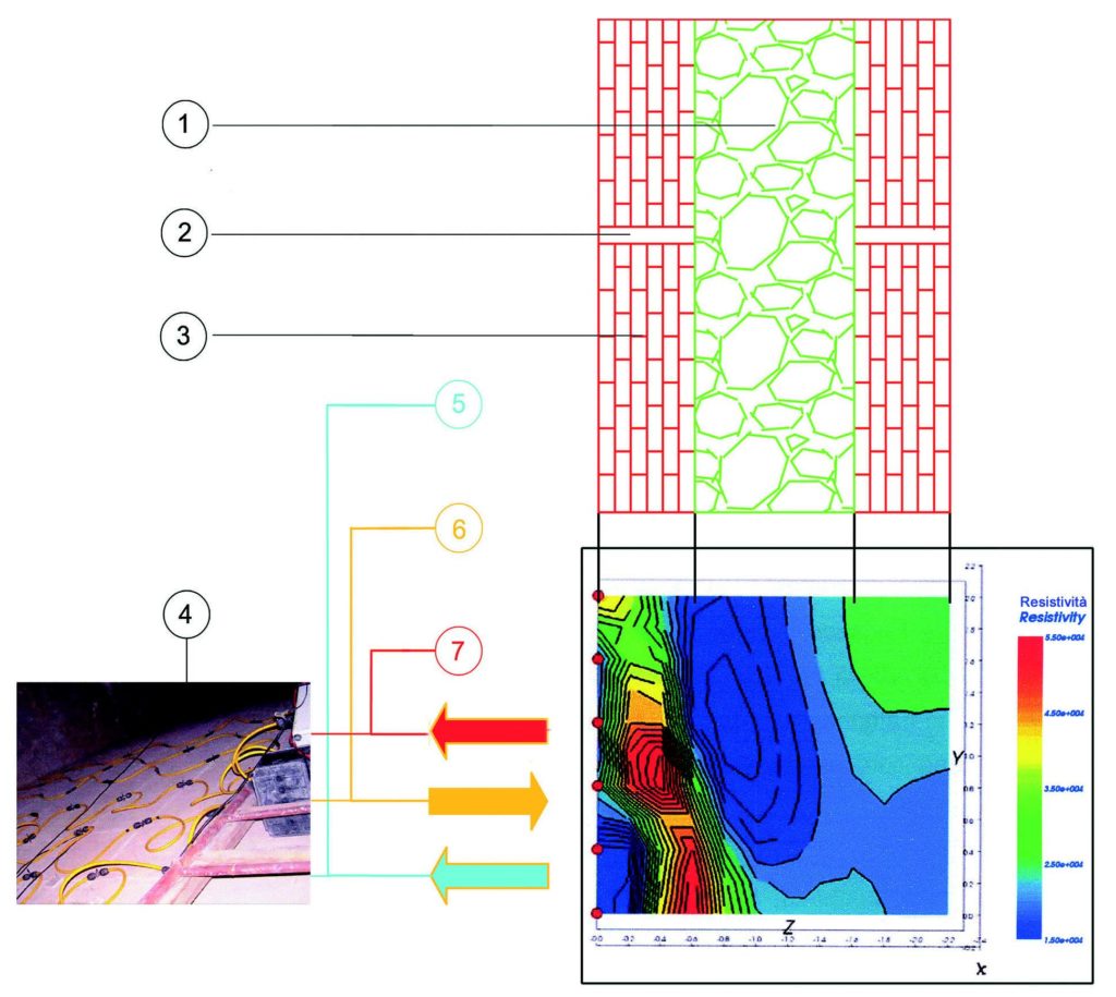 Tale modello è stato realizzato tenendo conto del volume “vuoto” sottostante il grigliato e rappresentato dal corridoio che attraversa la vela. I risultati hanno evidenziato la presenza di materiali con valori di resistività assai diversi fra loro, in particolare è stato riconosciuto un primo livello superficiale (lato estradosso) dello spessore di circa 0,50-0,60 m con valori di resistività compresi tra 4.5 x 104 Ωm e 5.5 x 104 Ωm.