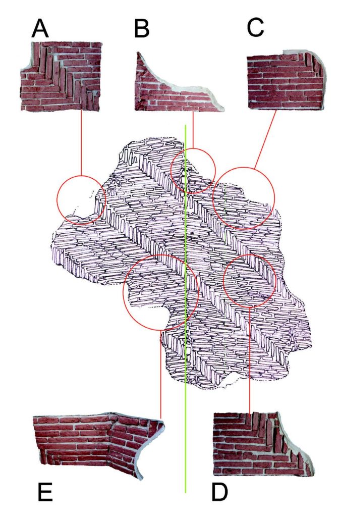 Per la parte intermedia, definita “riempimento”, è possibile ipotizzare un vero e proprio sacco con materiale incoerente, oppure una diversa apparecchiatura degli elementi in cotto.