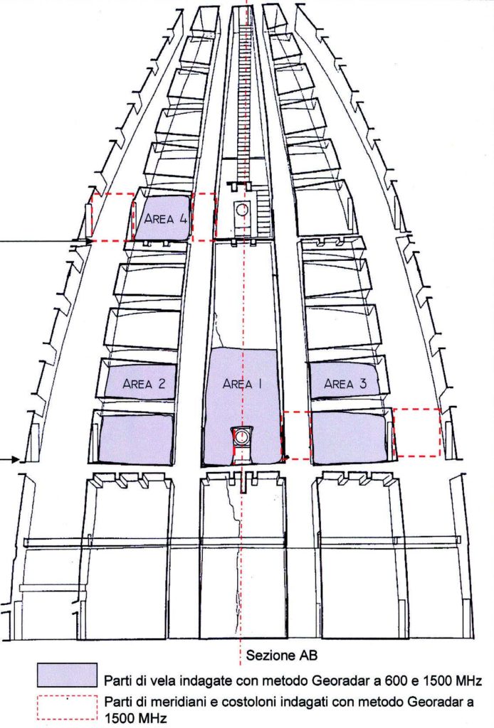 A partire dal 2000 sono state realizzate indagini geofisiche non invasive utilizzando strumentazioni georadar sull’estradosso della vela interna, posta a sud-est con antenne da 600 e 1500 MHz e con verso di percorrenza sulla superficie della vela perpendicolare rispetto al piano di rife- rimento dei ballatoi, dal basso verso l’alto e con passo di 40 cm.