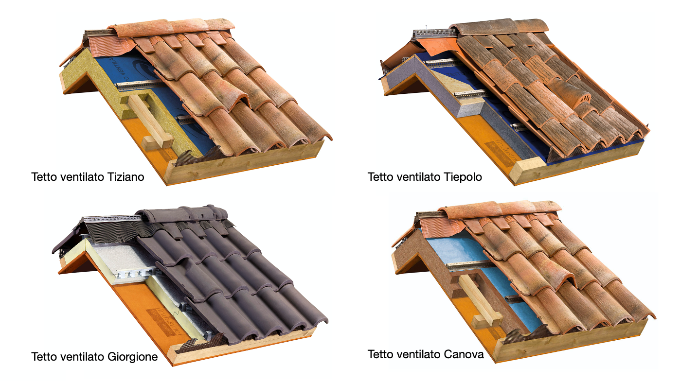 Industrie Cotto Possagno – realtà tutta italiana e che opera, a livello internazionale nel settore delle soluzioni tetto in laterizio complete, all’avanguardia nel proporre sistemi innovativi e rispettosi dell’ambiente – offre soluzioni complete per un tetto ventilato dalle elevate prestazioni tecniche, estetiche e funzionali e per il risparmio energetico: Tiziano, Tiepolo, Giorgione e la novità Canova. Quest’ultima, grazie alla salubrità e alle peculiarità della fibra di legno per un tetto isolato e ventilato, offre elevate prestazioni per l’isolamento termico ed acustico.