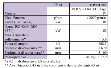 L’escavatore gommato Ewr150E coniuga l’ingombro di rotazione migliore del settore con un’ottima stabilità e capacità di sollevamento. La lunghezza ridotta non compromette lo sbraccio e le prestazioni di sollevamento e scavo. Il motore è Volvo Stage IV con tecnologia V-Act con nuovo sistema intelligente di rigenerazione passiva. Il sistema di sospensione del braccio con il circuito idraulico e gli ammortizzatori a gas favoriscono la guida sui terreni sconnessi.