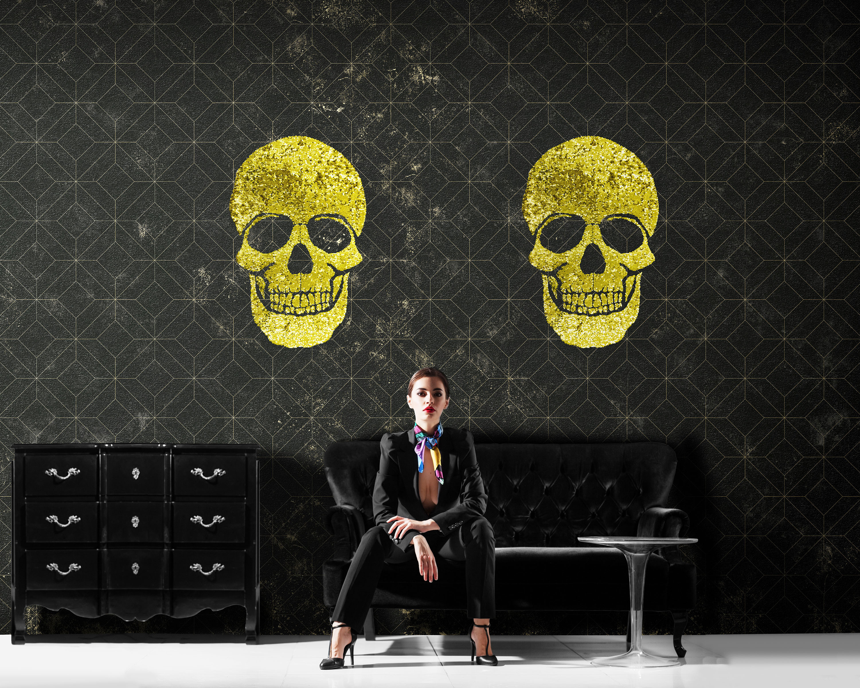 Una collezione irriverente e glamour in cui troviamo la carta da parati The Skull, dove gli elementi più preziosi ed esclusivi sono applicati a mano.  L’irriverente teschio è declinato in quattro diverse brillanti varianti: paillette cuvette oro/oro, paillette cuvette oro/nero, glitter oro brillante e crystal mesh.