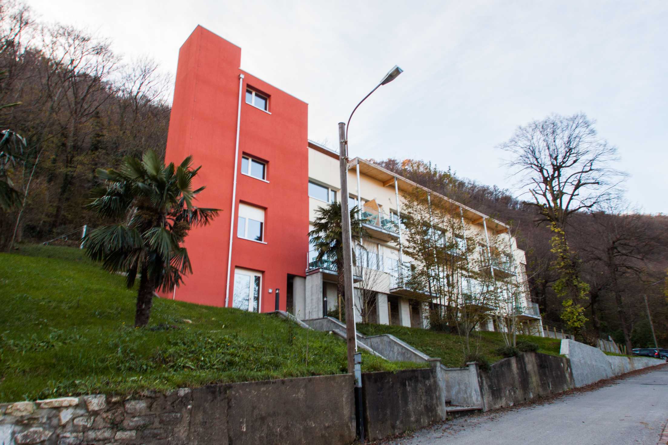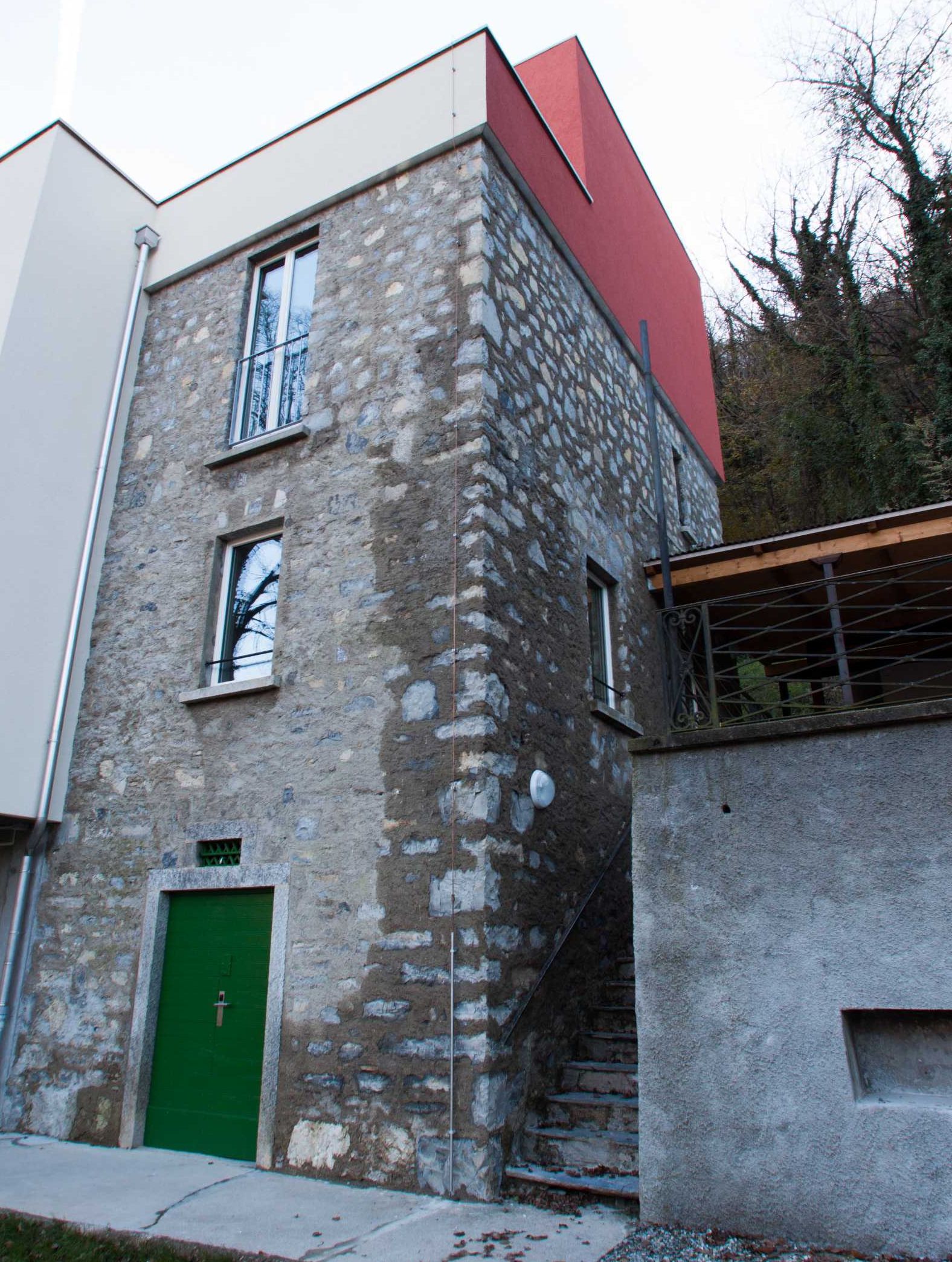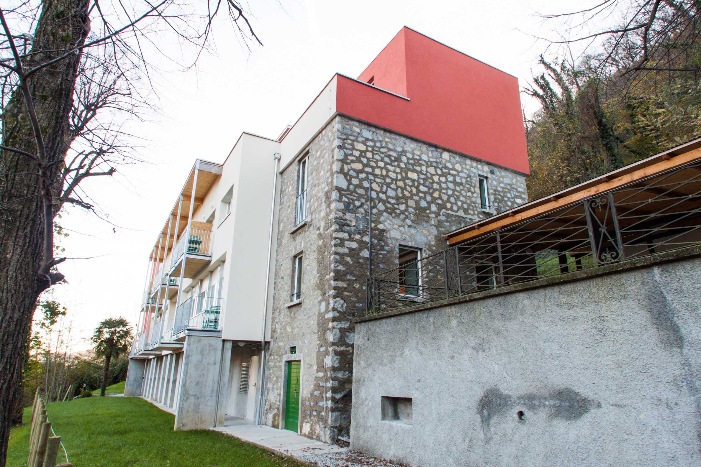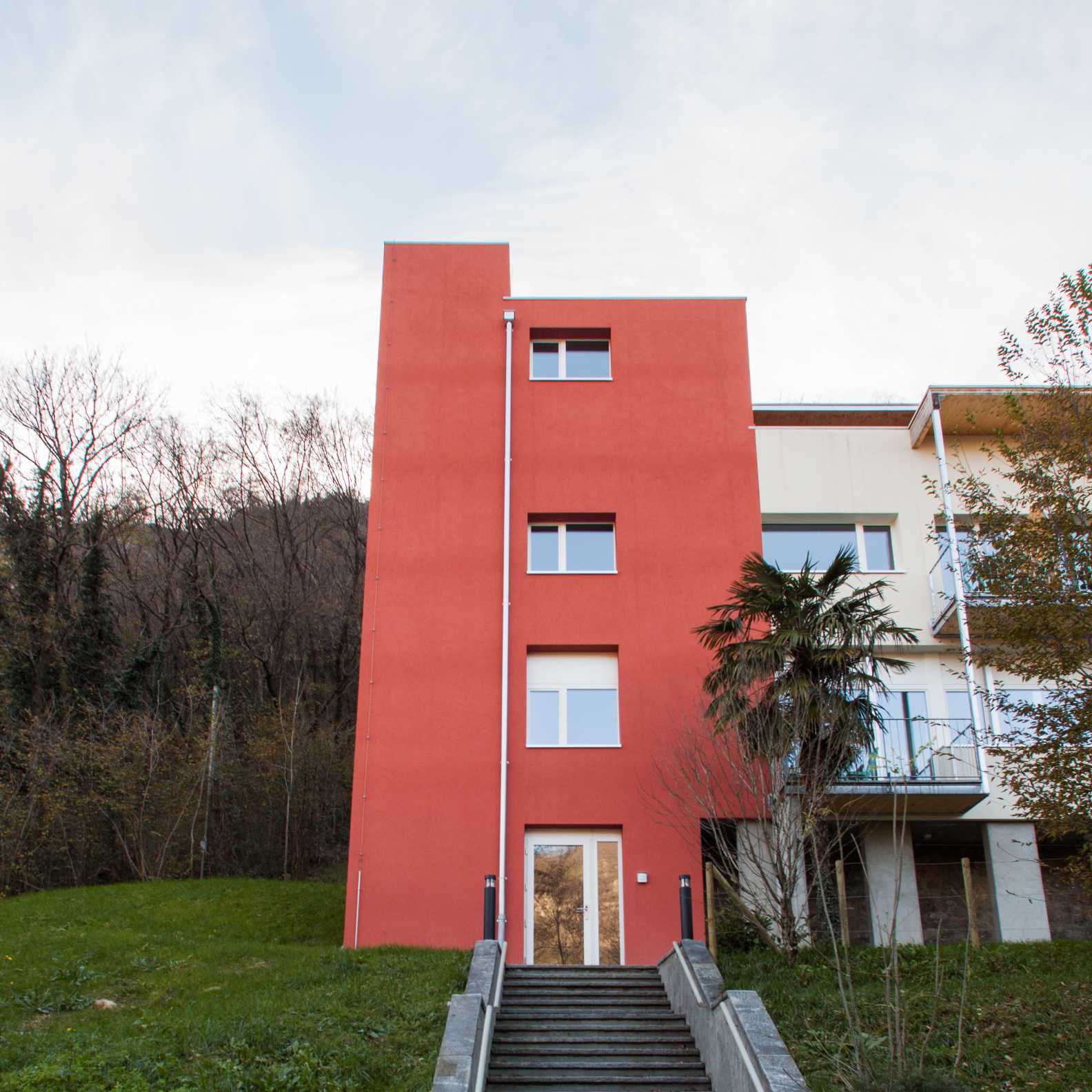 Al terzo piano, invece, trovano posto 9 stanze con doccia/wc e zona cucina-pranzo-soggiorno in comune. Alla base del declivio della collina, lungo la cui costa si insedia il fabbricato, insiste un’ampia area di pertinenza, direttamente collegata alla strada, sulla quale sono stati ricavati i 17 parcheggi di servizio allo stabile e riservati ai residenti. Da qui una storica scalinata in pietra, ricavata tra le mura antiche, conduce alla terrazza comune, dove è stata costruita una pensilina in legno con struttura portante in acciaio che segna l’ingresso laterale all’edificio che collega il primo piano residenziale direttamente all’esterno. Sotto la pensilina un particolare sistema di scalini di legno sfalsati tra loro s’inerpica sul fianco della collina, sbancata e arginata da un muro controterra in c.a. che protegge il passaggio verso il retro del fabbricato, qui una scala metallica mette in contatto con i piani superiori. Scendendo lungo la strada in pendenza collegata direttamente al piazzale s’incontra la storica scala di pietra che taglia la parte bassa del declivio come una sorta di cicatrice che si mimetizza con i colori del bosco e della collina e conduce direttamente all’accesso principale dell’edificio, al di là del quale si articolano i collegamenti verticali, racchiusi dal blocco rosso del corpo scale e ascensori, e gli ambienti comuni».