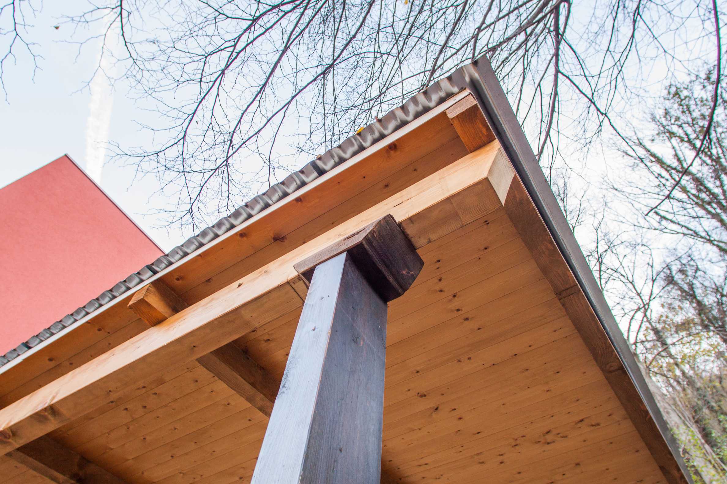 Copertura in travi di legno lamellare. La copertura è composta da una stratigrafia in cui l’elemento portante è costituito da travi in legno lamellare (dimensioni 12×28 cm passo 60 cm) piallate, smussate sugli spigoli. Lo strato isolante di lana di roccia da 20 cm è interposto tra le travi, mentre l’intradosso è rivestito con pannelli di legno di abete chiodati e lasciati a vista.