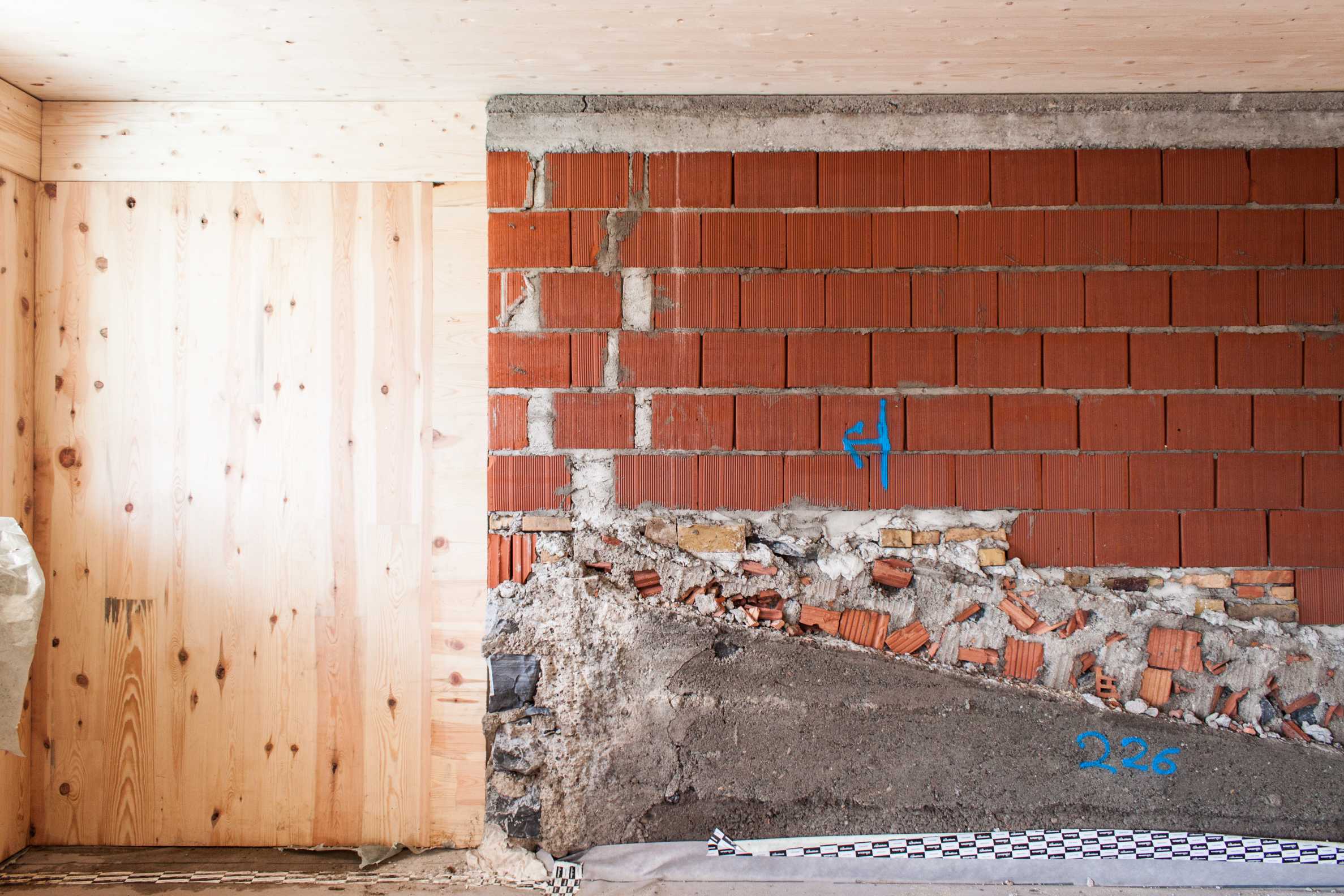 Demolizioni, consolidamenti e opere in muratura. Si è posta molta cura nel consolidamento delle murature dell’edificio esistente e nello studio del suolo dove collocare le fondazioni del nuovo complesso in costruzione, al fine di poter addossare e unire le parti. Dalle fondazioni che si ammorsano nella parte bassa del declivio della collina si alzano i setti in cemento armato che sorreggono la parte in elevazione dell’edificio, dedicata eminentemente agli spazi residenziali.