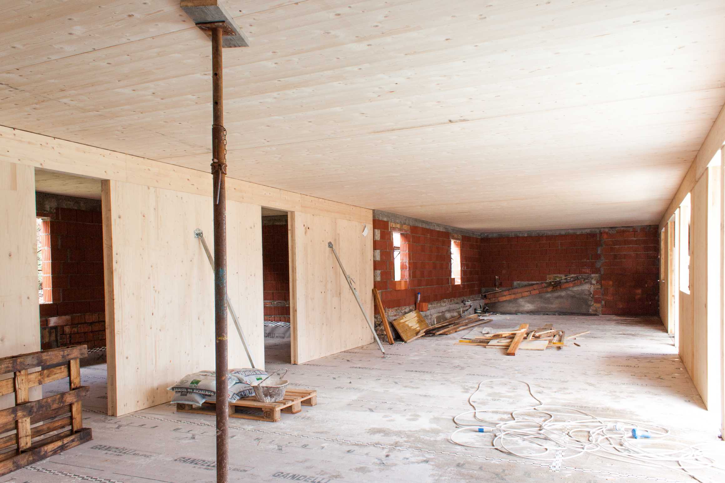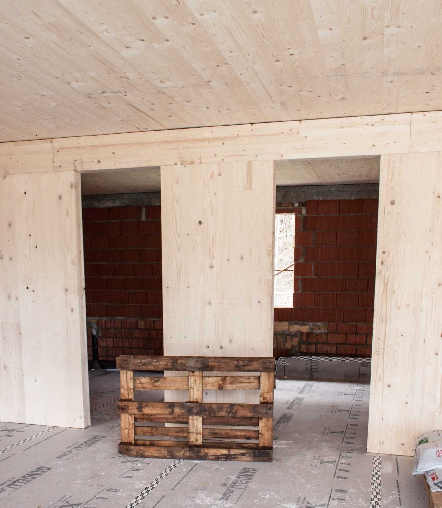Pareti e murature strutturali interne. Per la realizzazione delle strutture perimetrali di chiusura dell’involucro sono state impiegate pareti in pannelli X-Lam di spessore 100 mm composte da legno lamellare di abete a 3 strati incrociati ed essiccati artificialmente con umidità del 12%. I muri strutturali interni sono stati realizzati con le medesime specifiche tecnologiche e, successivamente, rivestiti con contro-pareti realizzate con lastre in cartongesso di tipo standard, dello spessore di mm 25.