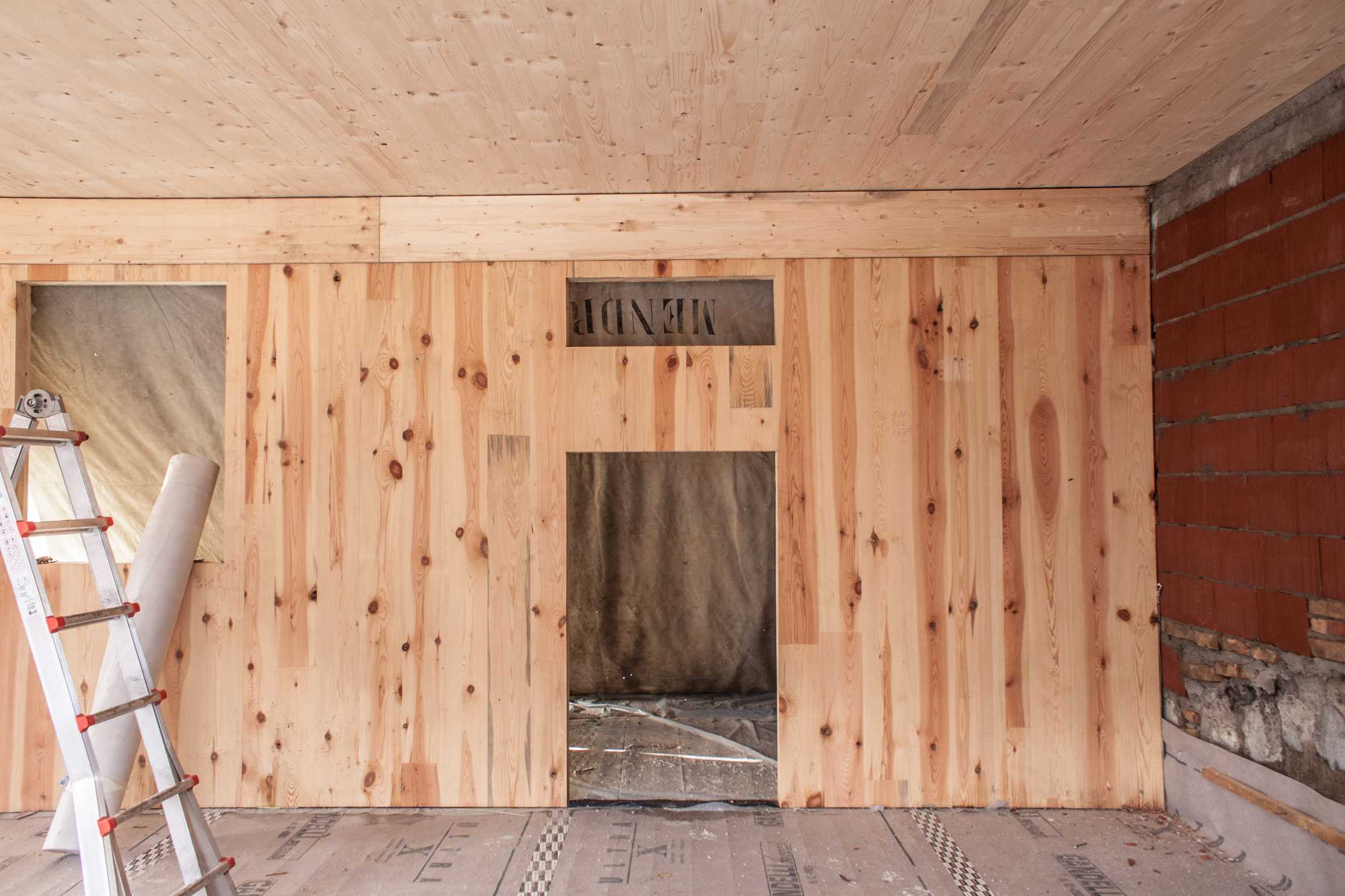 La disposizione incrociata delle lamelle longitudinali e trasversali di queste pareti permette di ridurre al minimo i fenomeni di rigonfiamento e ritiro del pannello, aumentandone la resistenza statica e la stabilità dimensionale. Per l’incollaggio dei vari strati di assi viene impiegato il collante Pur Purbond HB 110 Collano, privo di solventi e formaldeide. La giunzione tra un pannello e l’altro avviene tramite viti, scelta tecnica che permette alla struttura di assorbire e distribuire il carico in più direzioni.