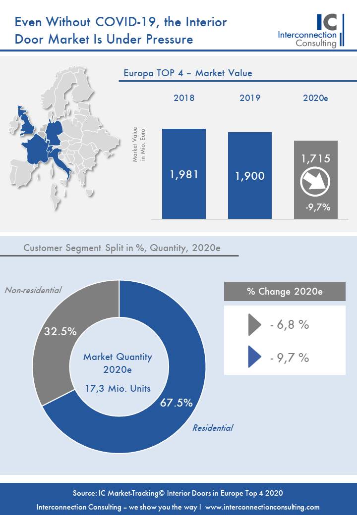 Nonostante la leggera ripresa prevista per il 2021, ci vorrà ancora del tempo prima che il volume di mercato in Europa torni ai livelli precedenti al 2019, come mostrato in uno studio svolto da Interconnection Consulting riguardante l’impatto della pandemia sul settore delle porte interne.