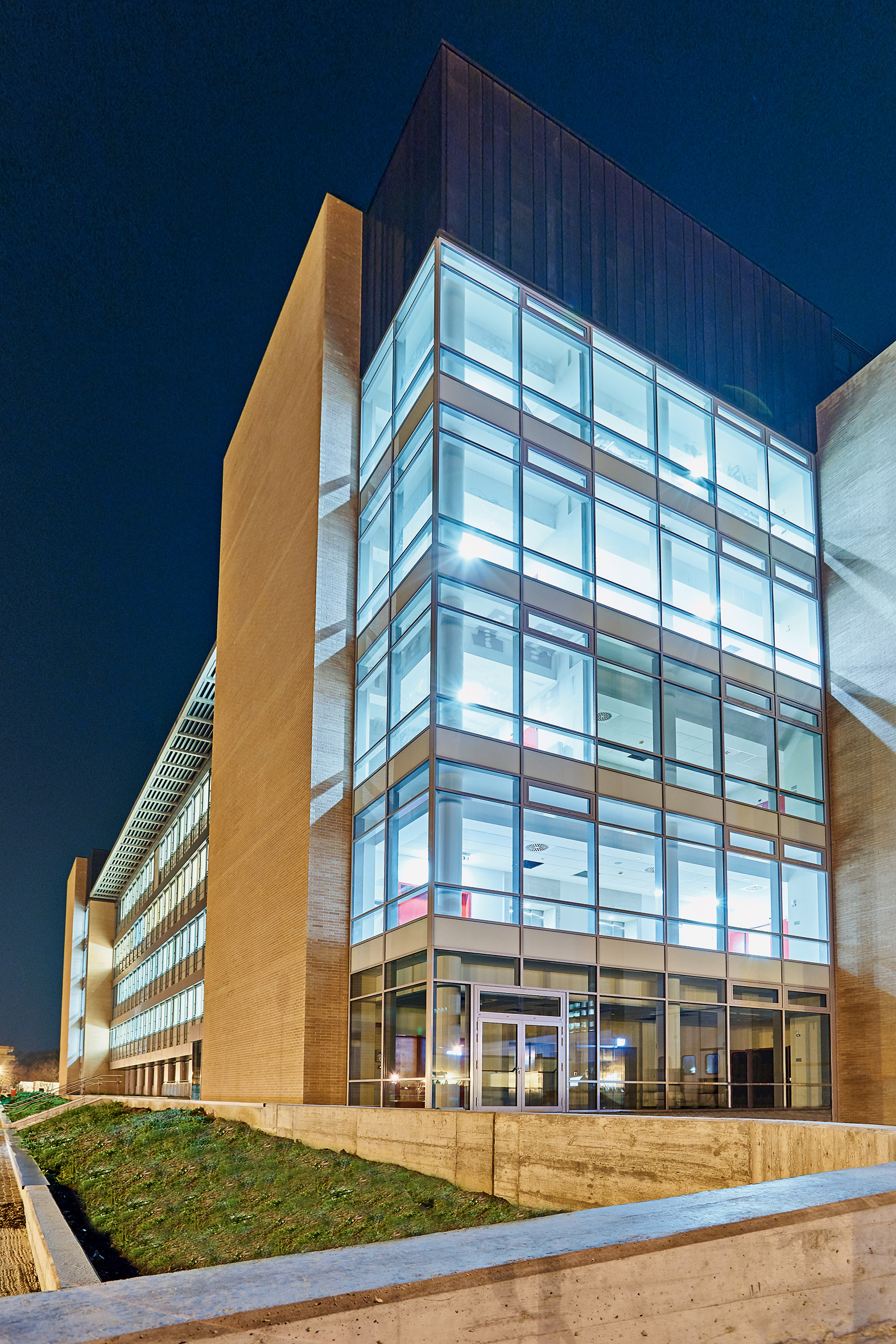 Vincitore del prestigioso Premio Cneto 2015, l’edificio che ospita il nuovo Core si distingue per la linearità e la compattezza dei volumi, scelta progettuale che ha condotto a una felice sintesi fra rigore formale e flessibilità funzionale. Lungo i prospetti, alle massive strutture angolari rivestite in laterizio faccia a vista – memori della tradizione costruttiva locale – si alternano leggere e performanti superfici trasparenti, realizzate con sistemi Schüco per facciate continue.