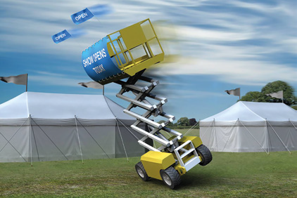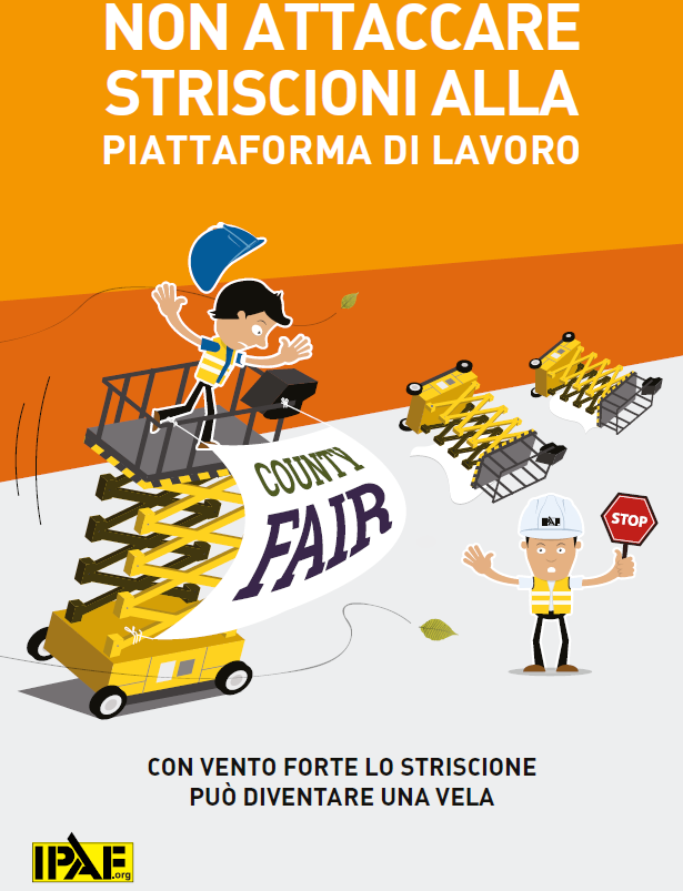 La International Powered Access Federation (Ipaf) esorta gli organizzatori e gli espositori delle fiere nazionali e regionali e dei festival locali a non fissare striscioni alle piattaforme a pantografo, in quanto ciò può creare l’effetto vela che destabilizza e ribalta la piattaforma.