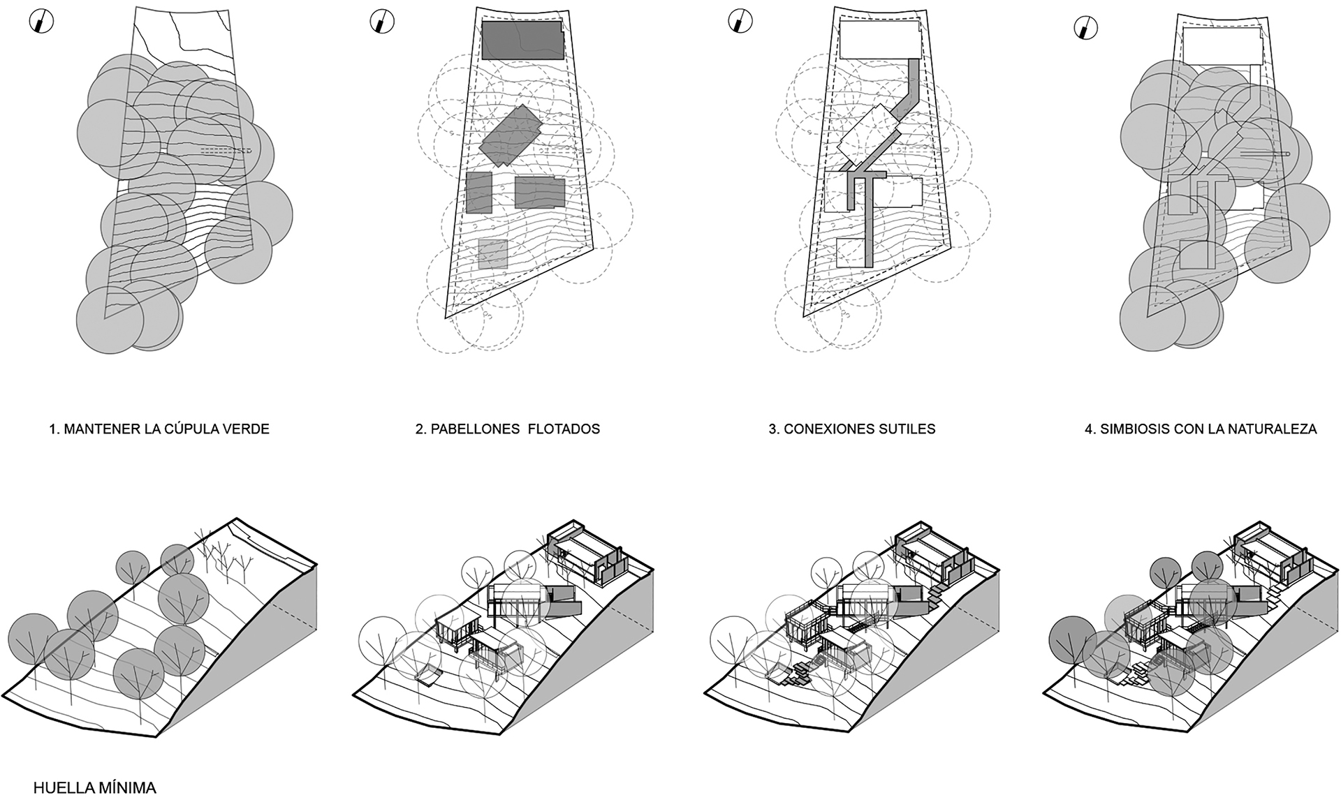 Su un terreno di 700 mq, con una pendenza variabile dal 28 al 35%, l’architetto Moises Morales ha creato un’abitazione diffusa, composta da quattro volumi indipendenti, sospesi da terra e collegati da scale, corridoi e ponti esterni.