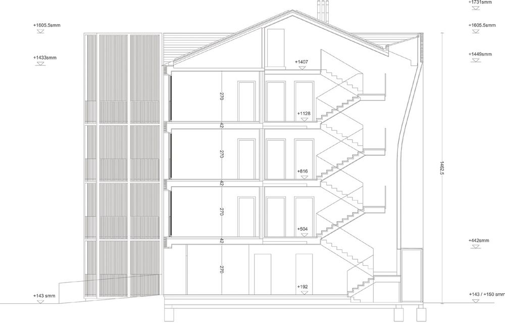 I fronti, a differenza delle piante degli alloggi di taglio tradizionale, alternano porzioni in cui le finestre e le portefinestre dei differenti livelli sono sovrapposte verticalmente tra di loro con quelle in cui risultano palesemente sfalsate.