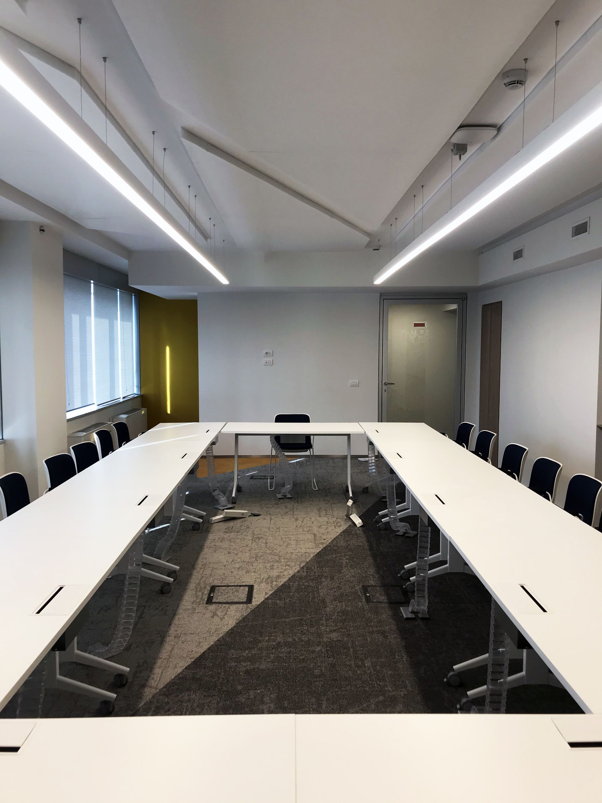 Si è trattato di un progetto di riorganizzazione degli spazi tecnicamente complesso per via della conformazione della struttura che presentava altezze troppo ridotte e un controsoffitto in cartongesso continuo, con altezze minime tra plafone e intradosso del solaio, con ridotte possibilità d’intervento sul controsoffitto, con impianti d’illuminazione esistenti che sarebbero stati poi recuperati.