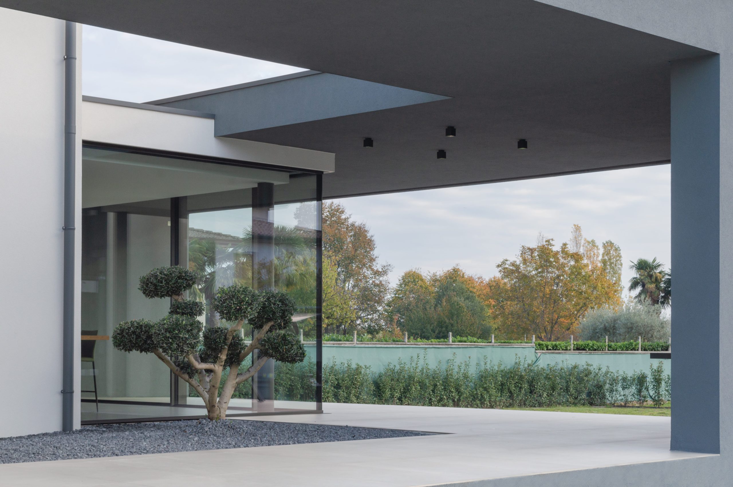 Fondamentali per la nuova percezione dello spazio sono anche gli accorgimenti architettonici e strutturali, veri e propri connettori visivi tra interno ed esterno, come le ampie vetrate nella zona living e il bow window nella zona giorno, che protrudono dalla sagoma del corpo principale, rivolgendosi verso l’esterno.