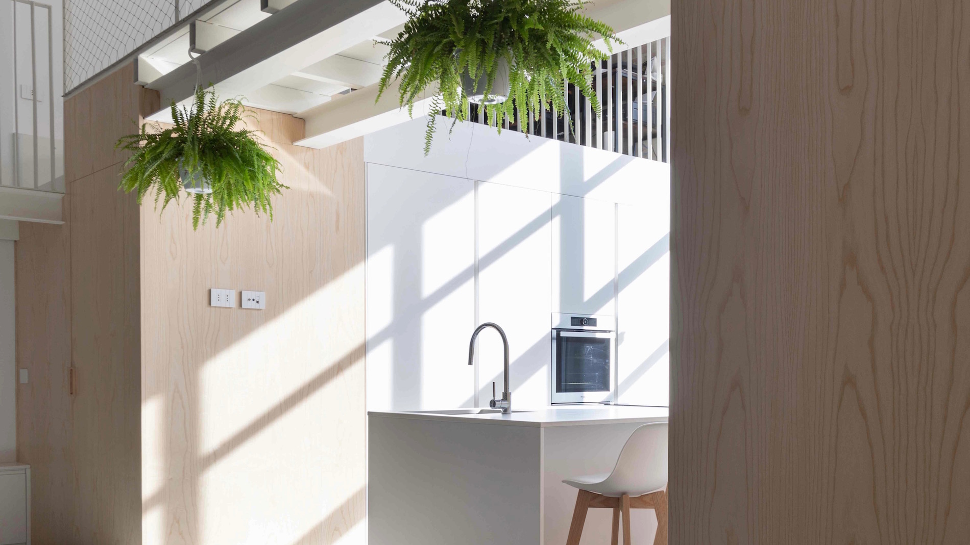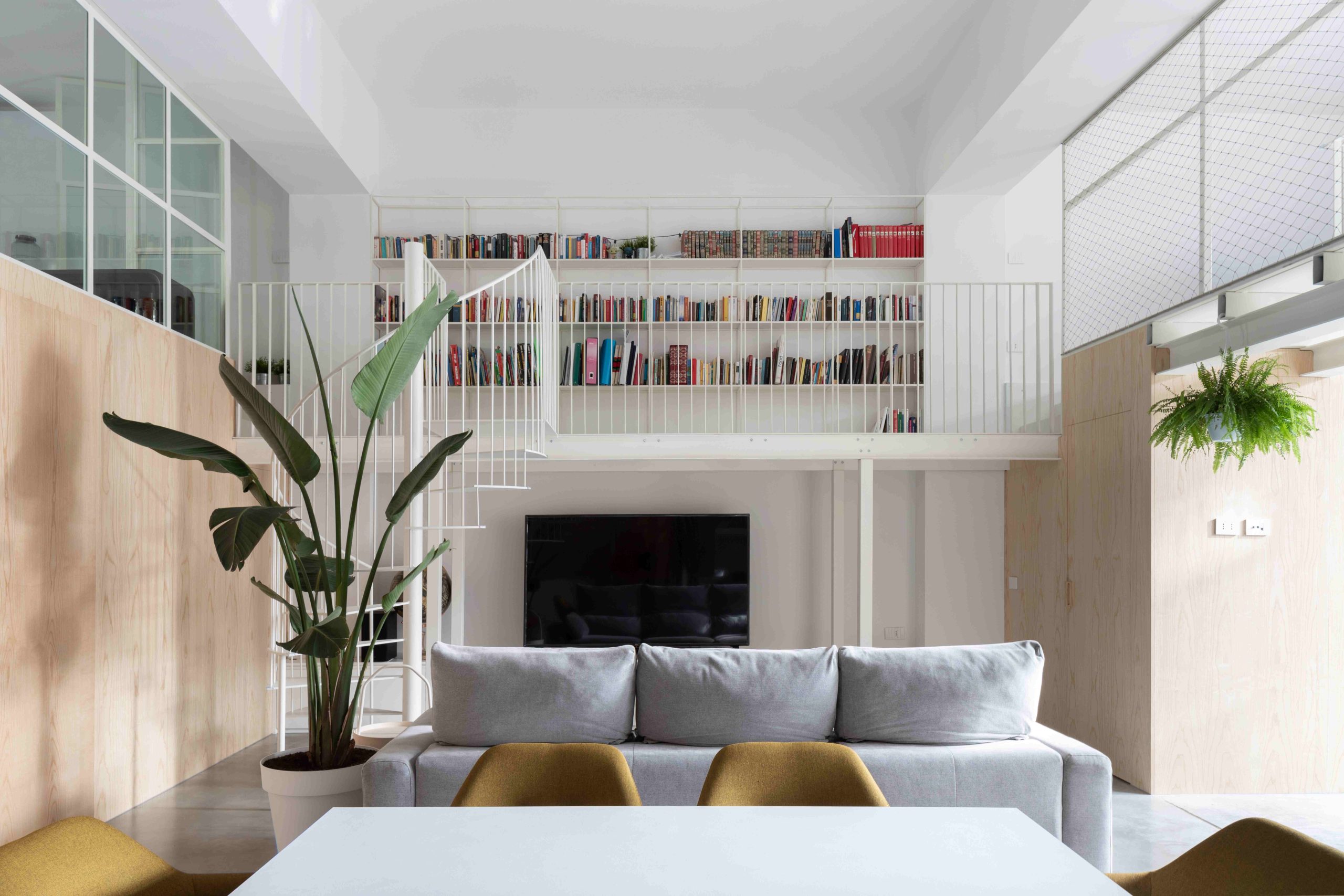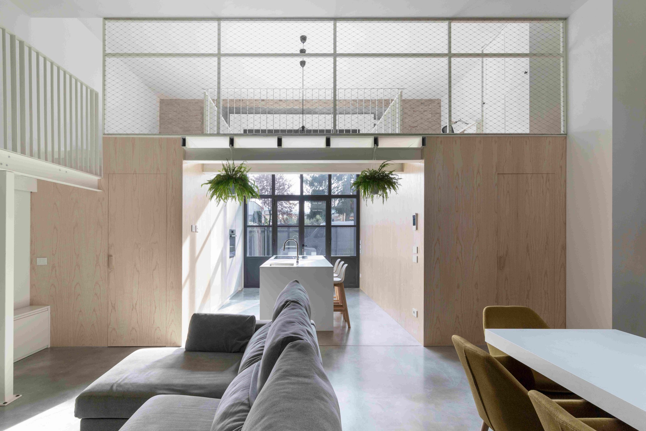 L’edificio, completamente svuotato all’interno, è stato riqualificato dal punto di vista energetico con l’isolamento dell’involucro, l’installazione di infissi ad alte prestazioni e di un impianto di riscaldamento a pavimento. La distribuzione degli spazi è stata ripensata attraverso l’inserimento di tre volumi in legno di faggio, che svolgono una doppia funzione: definire l’organizzazione interna e ospitare le zone più private, come bagni, lavanderia e camere da letto. La parte superiore di questi volumi è stata adibita a spazi di lavoro: uno studio per lo smart working e una sala per yoga e pilates. Un sistema di passerelle in acciaio, con balaustre e reti di protezione, collega i volumi e permette di muoversi nello spazio in modo dinamico, mentre una scala a chiocciola in metallo funge da elemento di collegamento verticale.