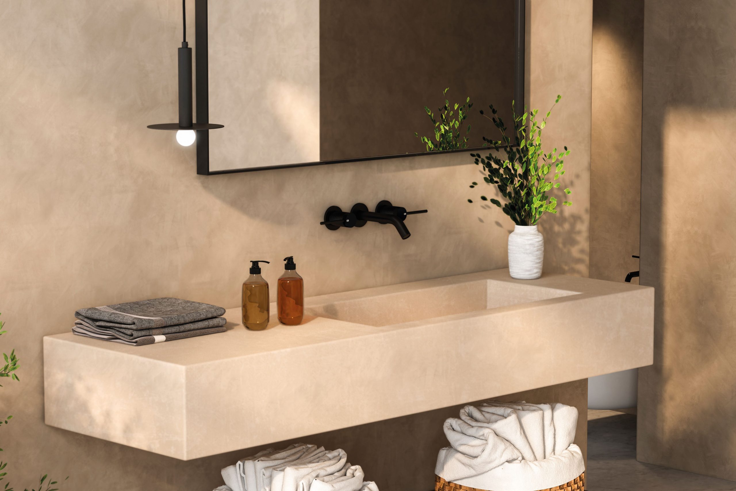 Applicabile sia a pavimento che a parete, Microverlay con Effetto Loto assicura ancora più durabilità delle superfici e al contempo minor tempo necessario per la manutenzione.