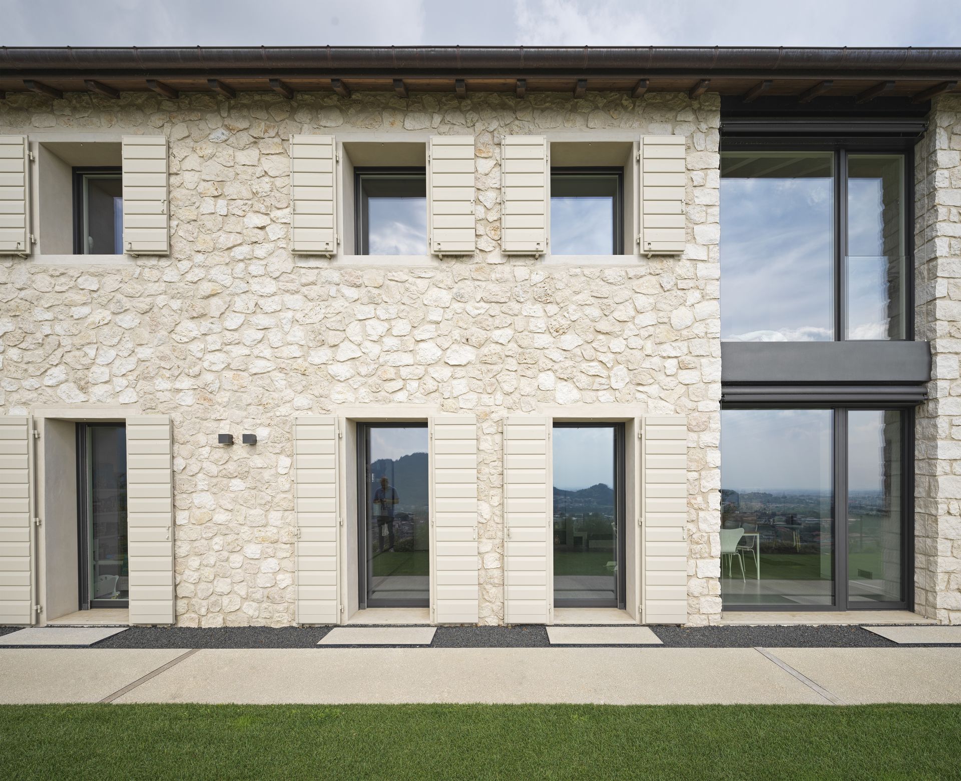 Alle pendici del massiccio del Grappa (Vicenza), trova spazio una nuova abitazione, in posizione privilegiata: disposta lungo il declivio della montagna è ottimamente esposta alla luce e all’aria e gode di una splendida vista sulla piana bassanese che si estende fino ai monti Berici e ai Colli Euganei.