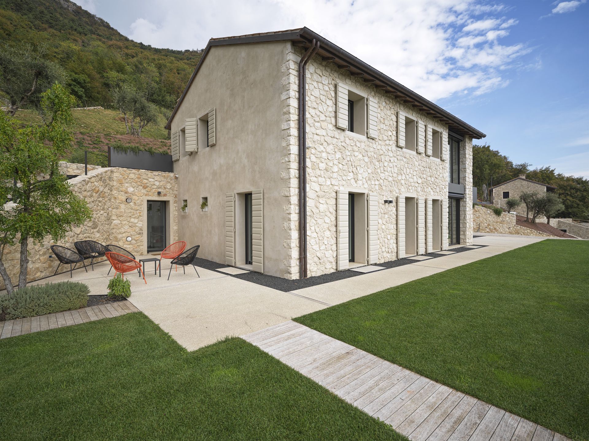 Questa particolare narrazione concettuale tra passato e presente si traduce visivamente nella scelta dei materiali per l’esterno per la più alta mitigazione dell’intervento con il contesto. Accanto al maestoso corpo monolitico con coperture d’acciaio, infatti, l’intonaco tradizionale e la pietra locale faccia a vista rivestono le facciate, in monocromia. Tutt’attorno, le superfici orizzontali alternano al manto erboso la pavimentazione in sasso lavato Italian Terrazzo, senza soluzione di continuità, grazie ad inserti tra i giunti e le piastre di camminamento realizzati nello stesso materiale.