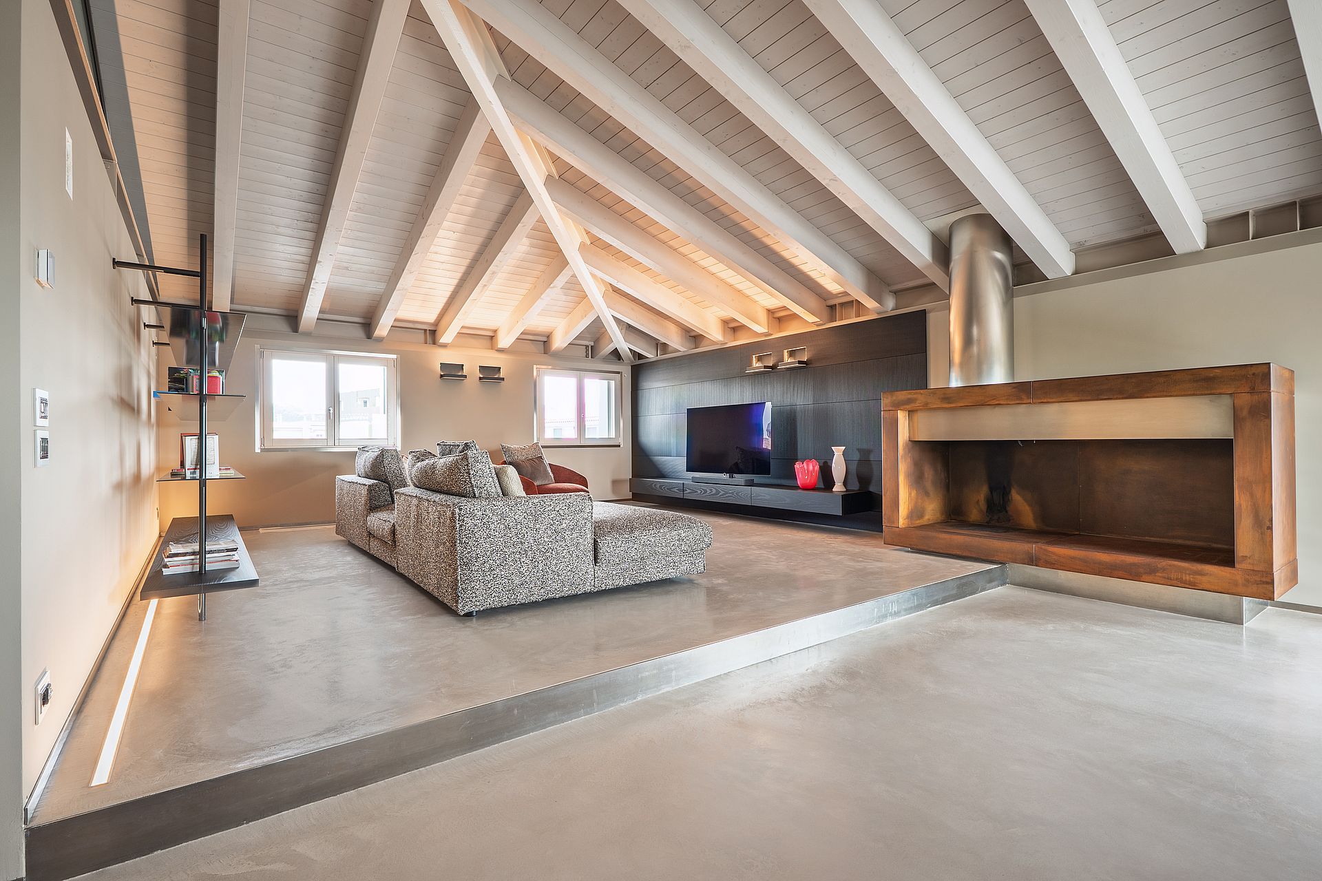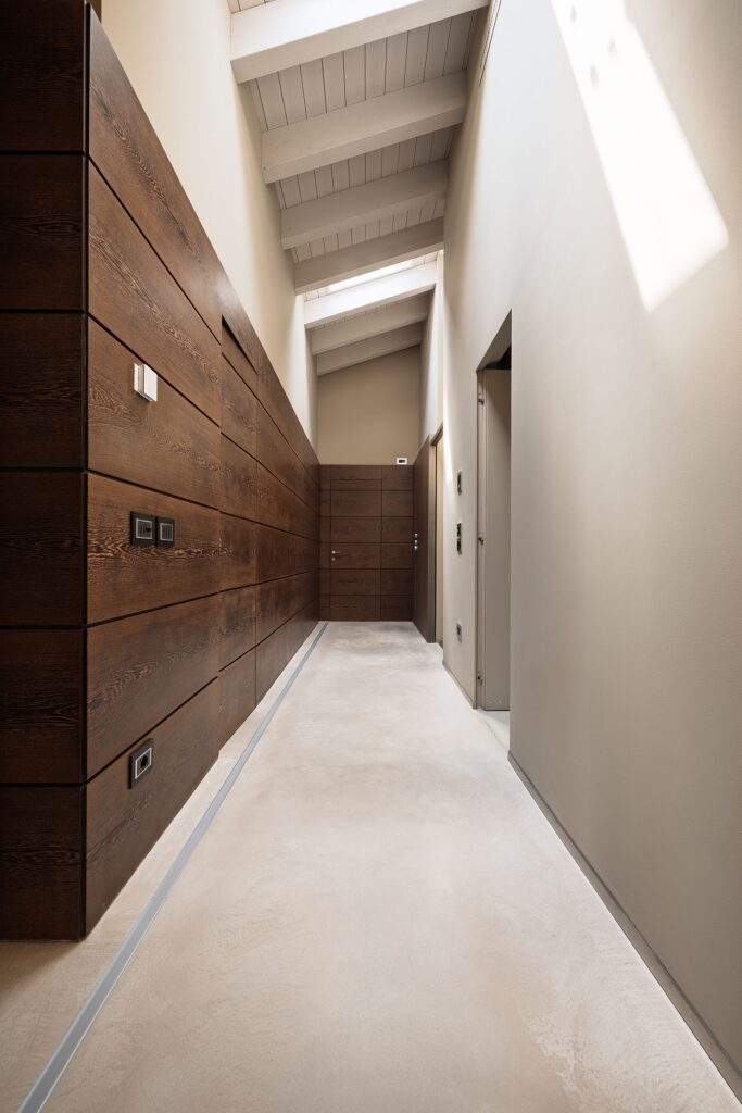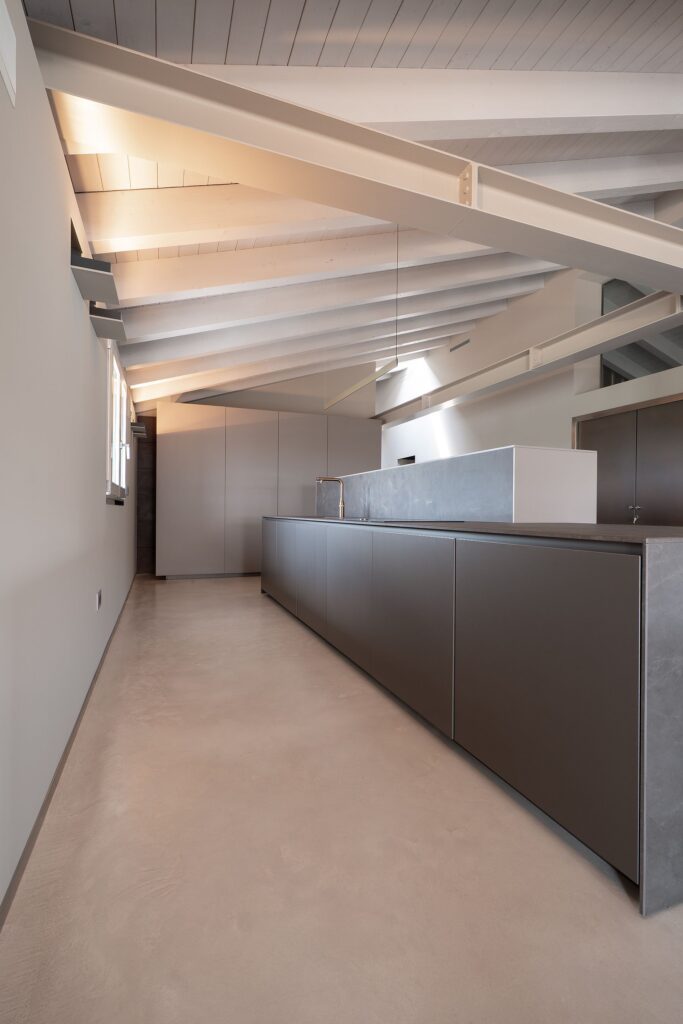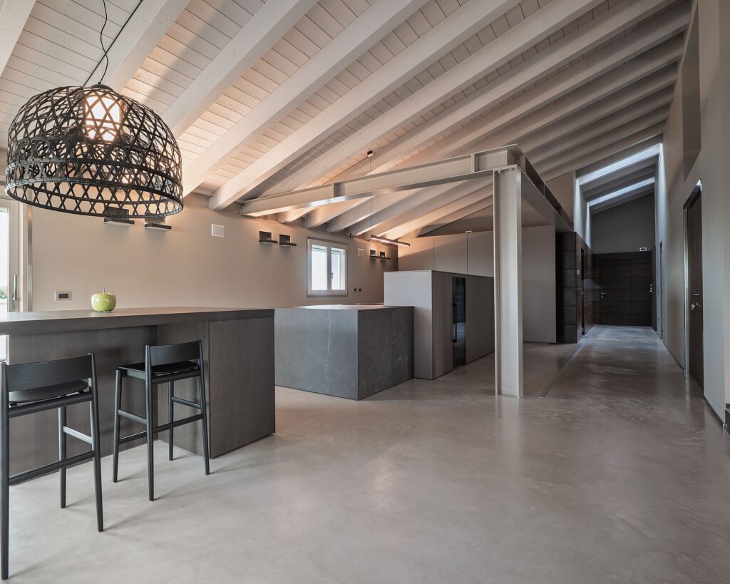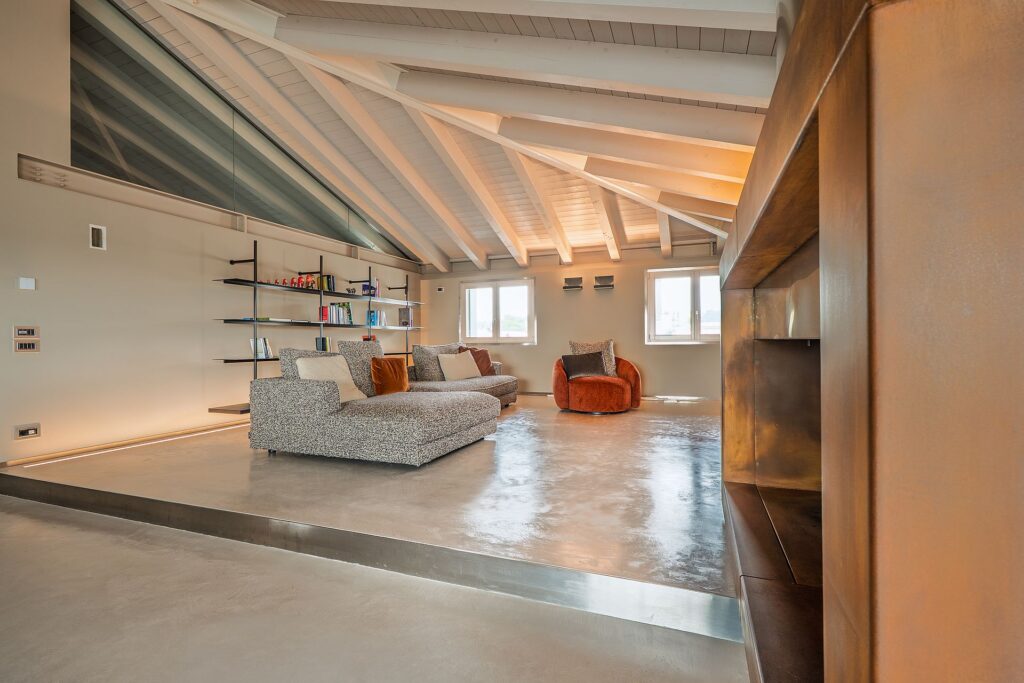 Isoplam protagonista in un attico di 350 mq a Montebelluna: pavimento continuo Skysense e finiture Oxydecor Rust definiscono superfici in continuità che amplificano luce, spazio e qualità materica in un progetto residenziale di alto livello.