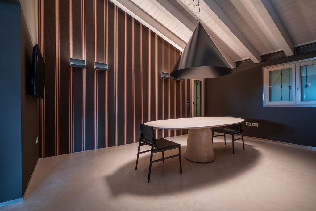 Accanto alle pavimentazioni, l’azienda è intervenuta anche sulle superfici verticali attraverso il brand Isocolor, occupandosi di pitture, finiture decorative e trattamenti smaltati, fino alla carta da parati in canapa della sala da pranzo.