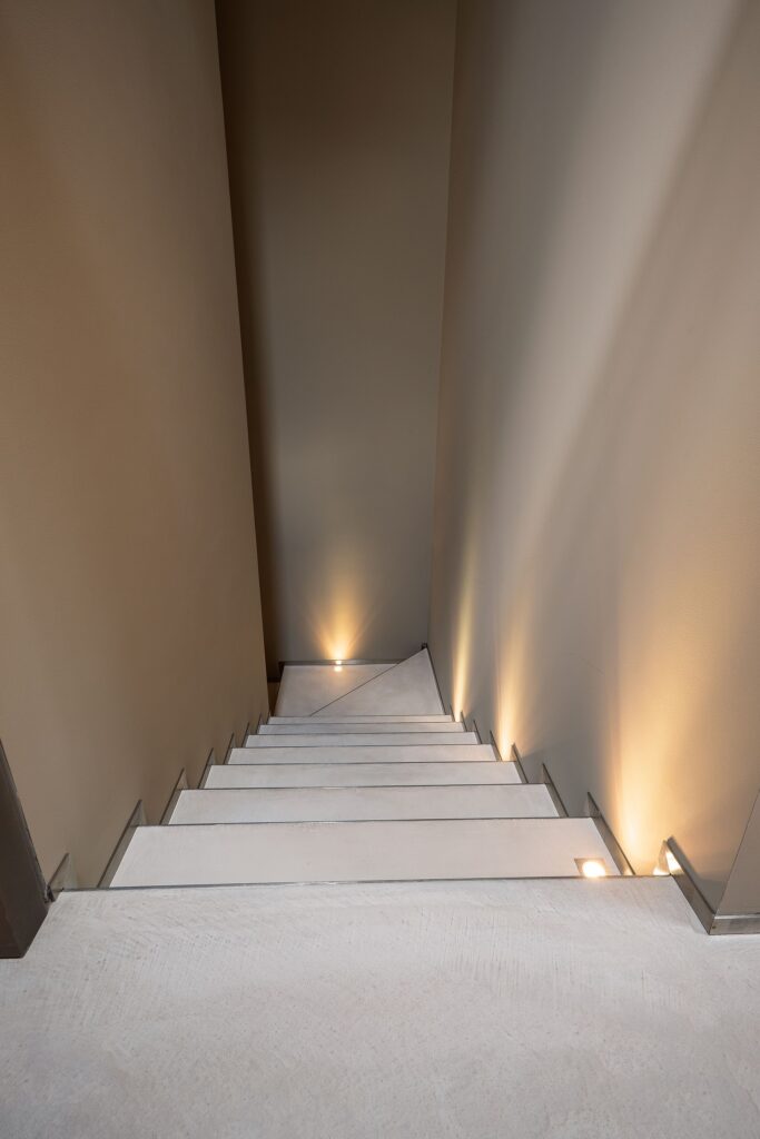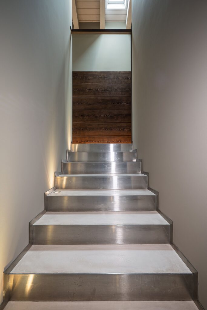 Anche il sistema dei percorsi concorre alla definizione del progetto. L’accesso all’attico avviene sia tramite ascensore diretto, sia attraverso una scala rivestita con Skysense, dove la presenza di faretti segnapasso preesistenti ha richiesto un accurato lavoro di posa e finitura manuale.