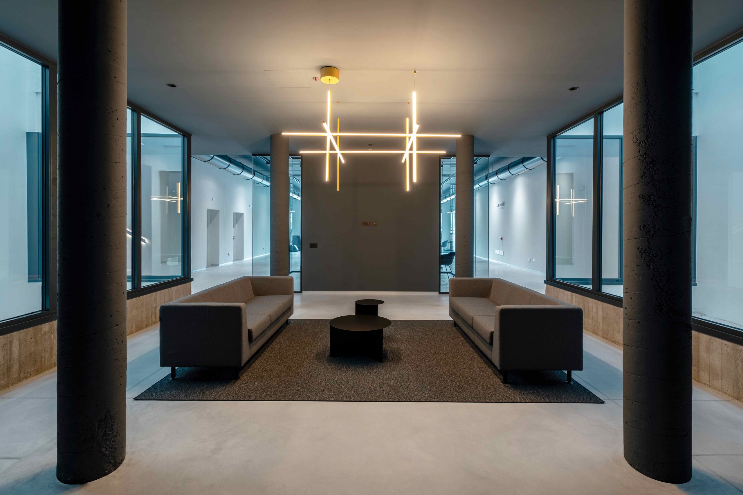 L’estetica industrial dovuta ai dettagli tecnici a vista, come i condotti di aerazione e i binari dei corpi illuminanti, viene ulteriormente potenziata dalla pavimentazione in Deco Nuvolato Isoplam, rivestimento continuo a base cementizia dalla particolare texture sfumata. Distribuita uniformemente su due livelli, la superficie si erge come elemento unificante degli ambienti, dalla reception ai corridoi, dalle sale riunioni agli uffici, fino alle aree destinate al relax. Il caratteristico look nuvolato, realizzato in color Light Gray, restituisce agli spazi un’eleganza austera e sofisticata, perfettamente in armonia con le linee pulite e contemporanee degli interni.