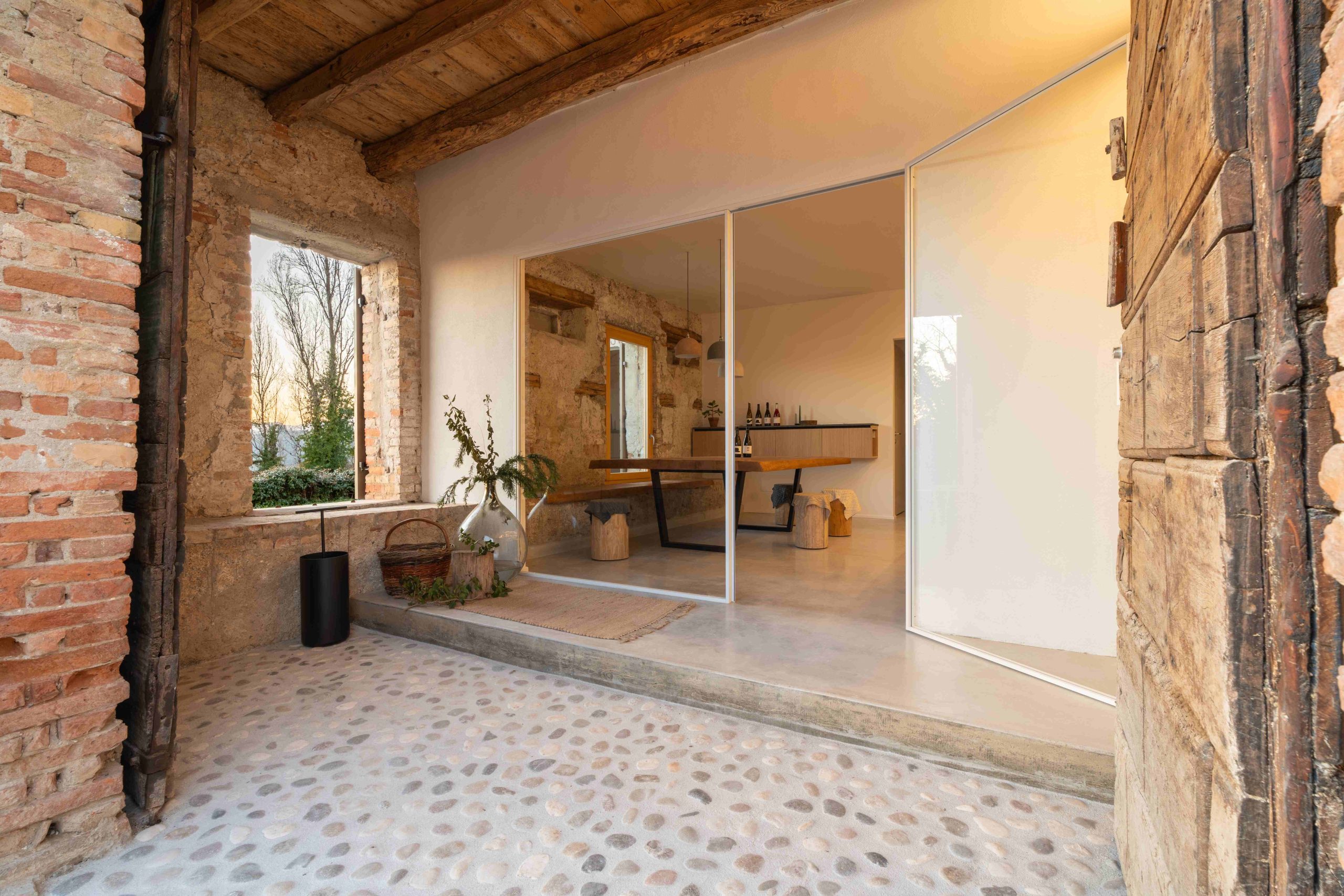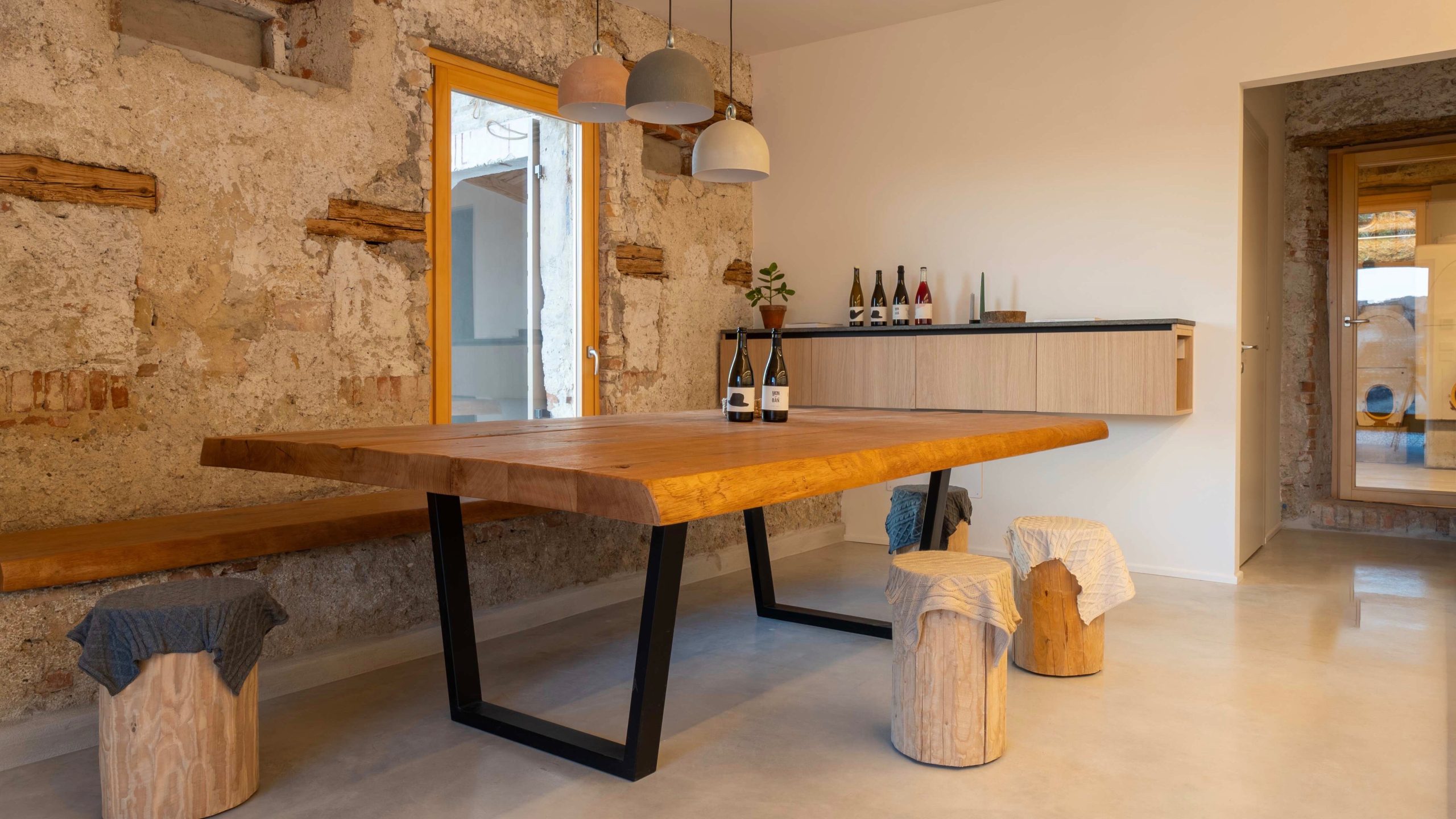 L’intervento di riqualificazione, esteso su circa 150 metri quadrati e suddiviso in portico, sala degustazioni e cantina, ha privilegiato la continuità con la preesistenza. Elementi originali come i portoni in legno, le pareti in sasso lavato e le vasche in cemento degli anni Sessanta sono stati preservati e integrati in una narrazione materica che esalta l’identità del luogo. Questa scelta progettuale si allinea con la filosofia produttiva della cantina, basata su fermentazioni spontanee, lavoro manuale e tempi lenti.