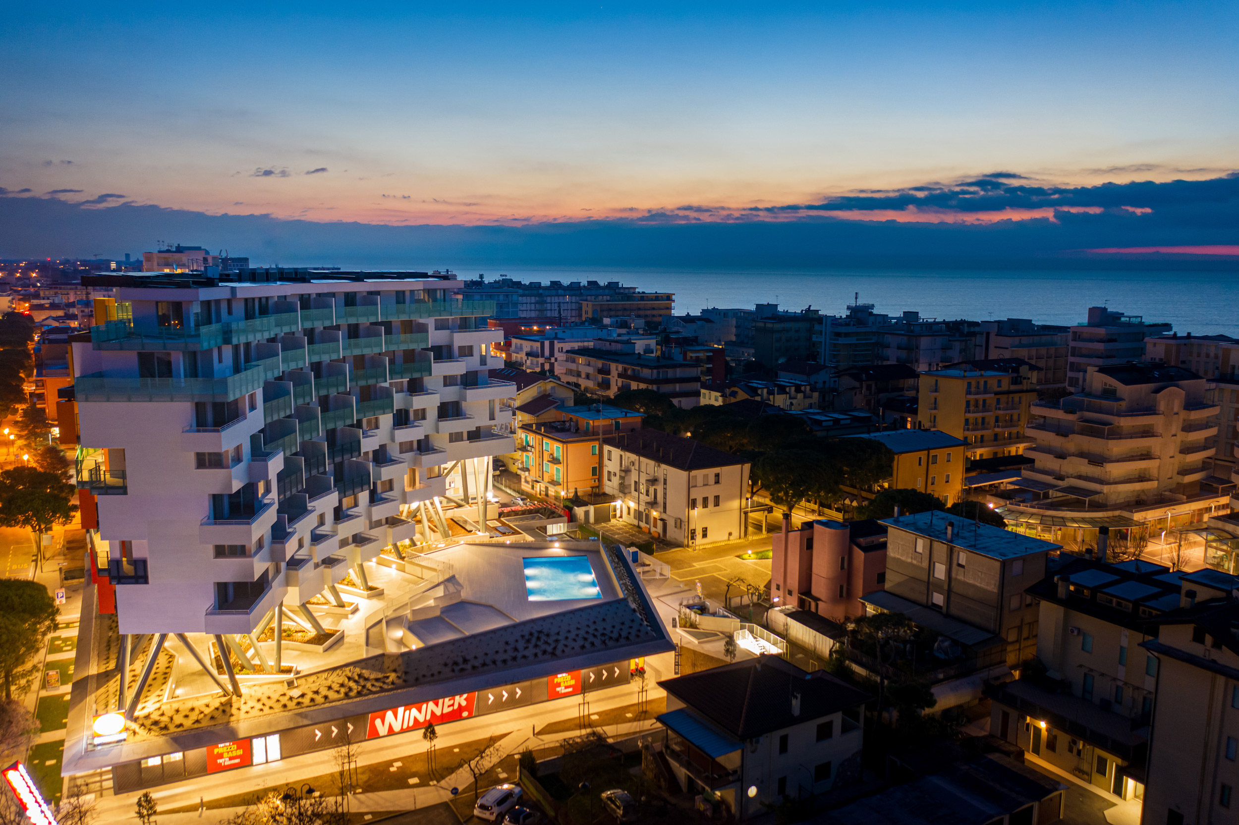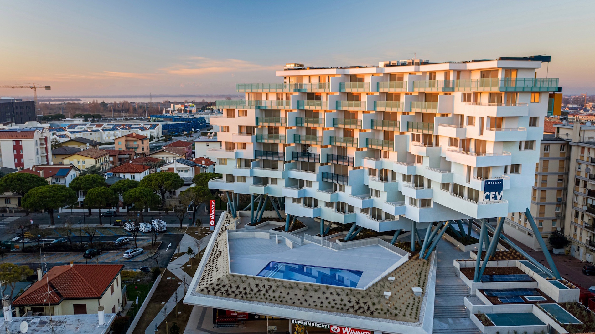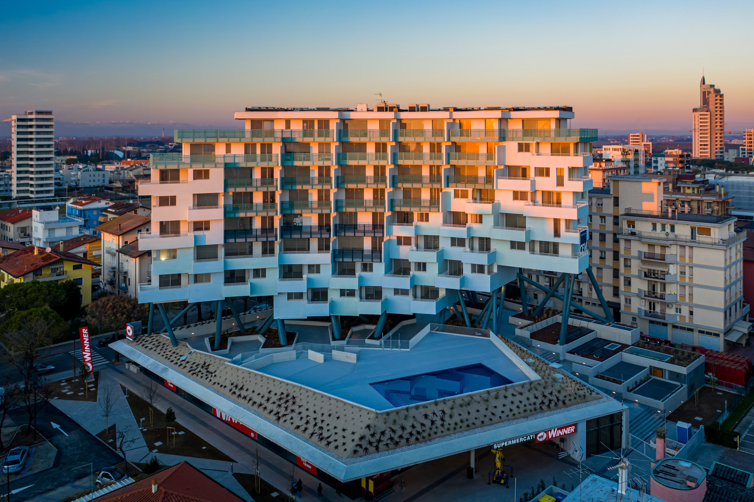 A poca distanza dal lungomare di Jesolo, in provincia di Venezia, l’originale architettura a sbalzi del complesso abitativo Podium fa parte di un ampio programma di interventi urbani per la crescita sostenibile della città.