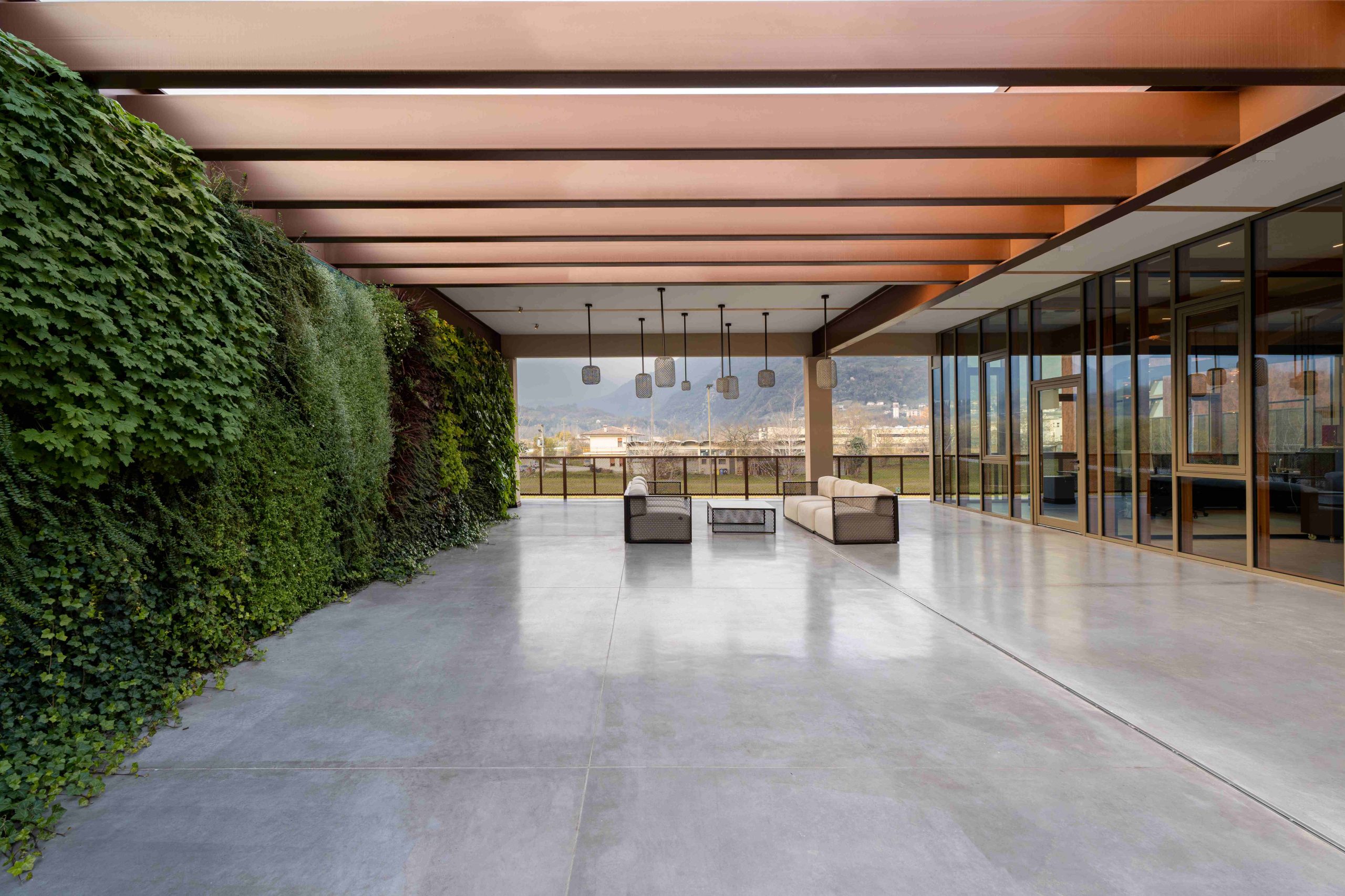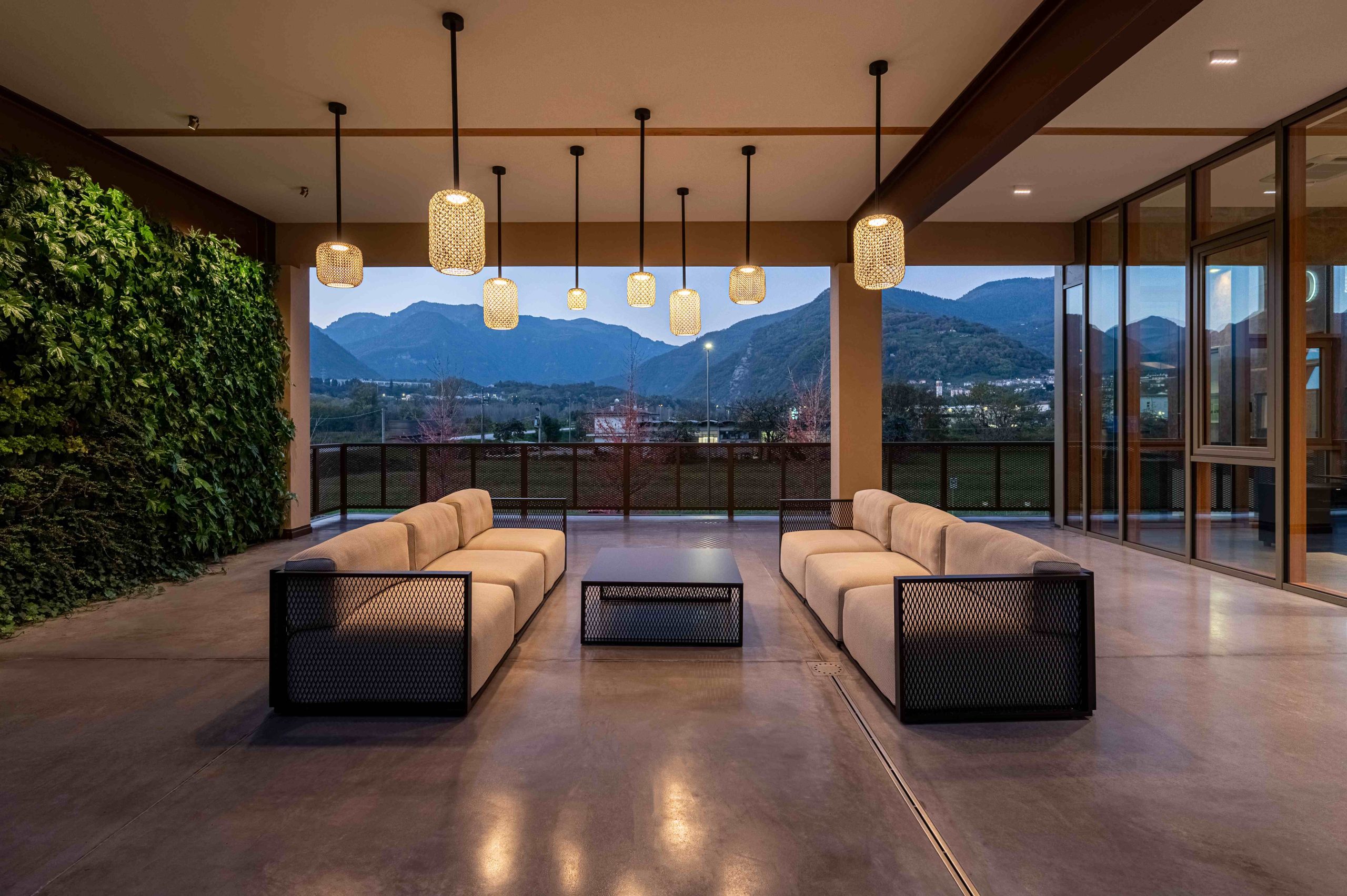 Elemento distintivo dell’ampliamento è la grande terrazza panoramica, concepita come spazio ibrido tra rappresentanza e comfort. Parzialmente coperta e protesa verso il paesaggio montano circostante, è stata progettata con la stessa cura riservata agli interni, adottando soluzioni materiche e compositive che ne valorizzano la fruibilità. La zona relax si distingue per i divani dalle forme generose e per i corpi illuminanti a sospensione che, con il loro design essenziale, sottolineano il carattere contemporaneo dello spazio.