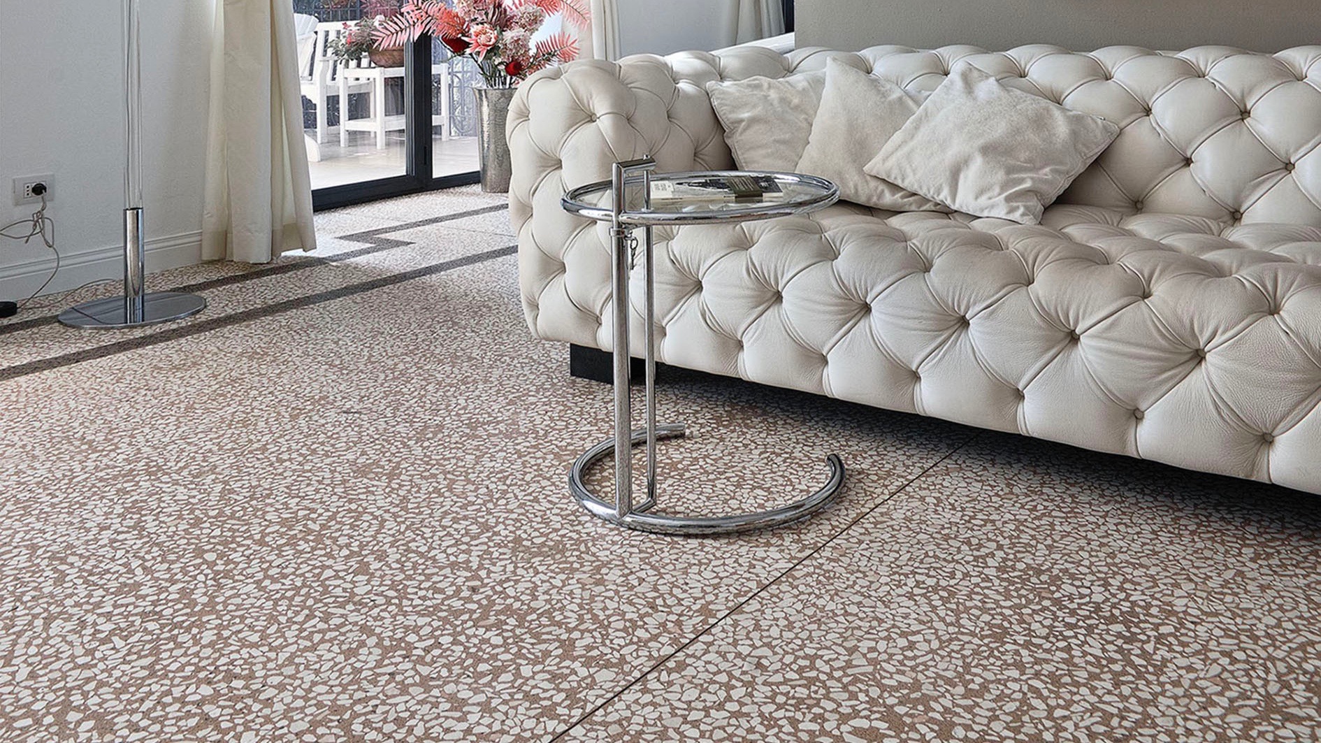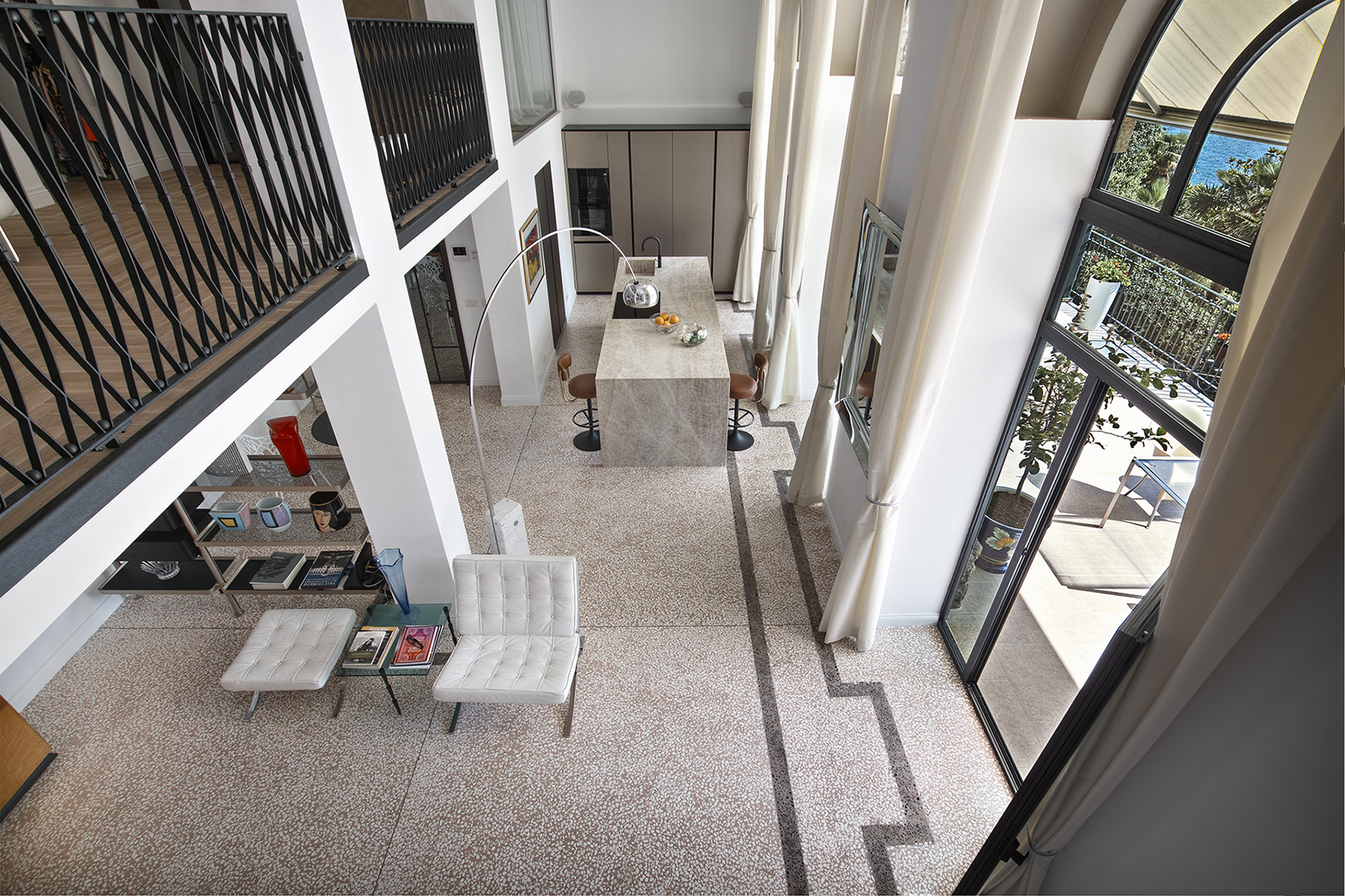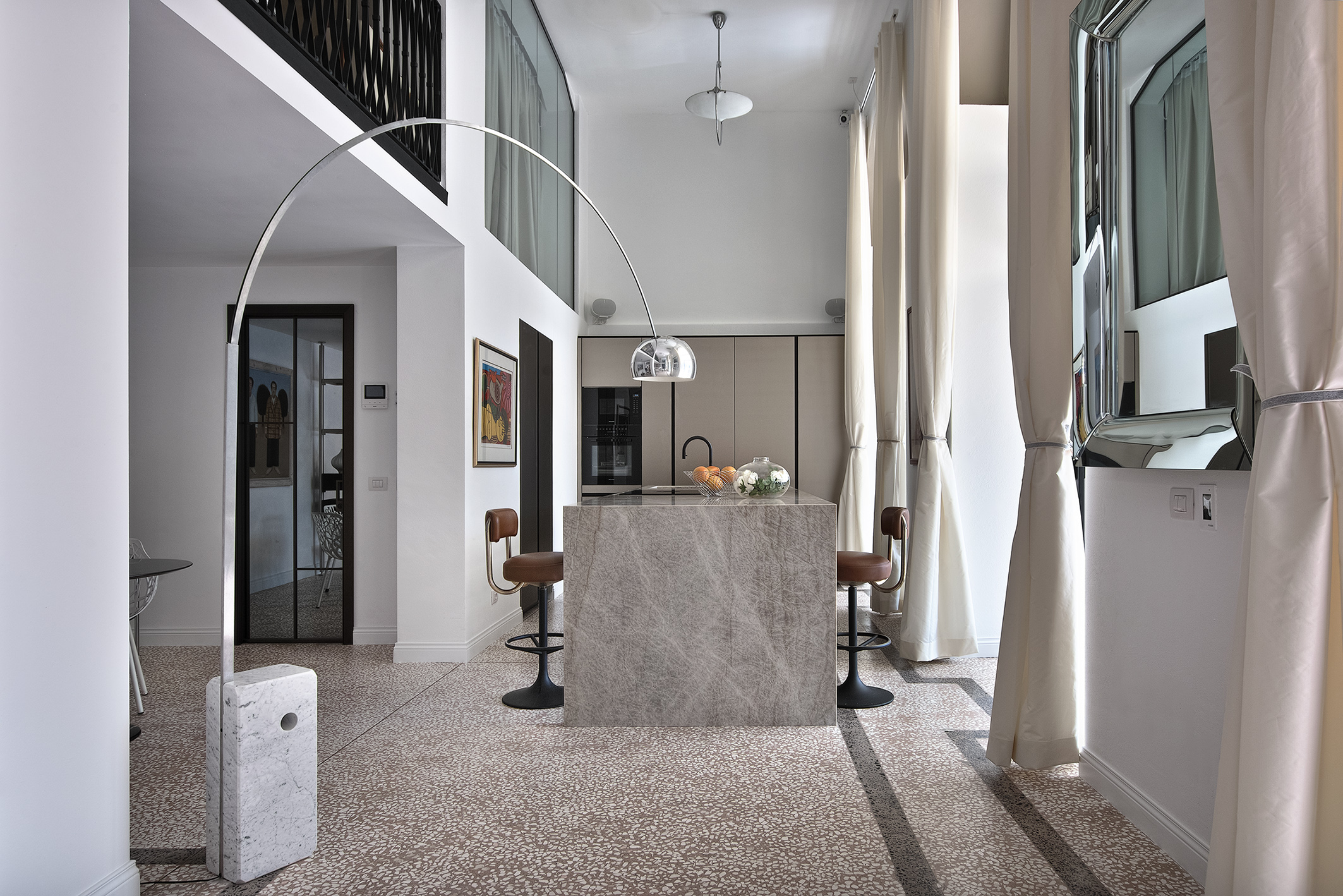 Per favorire l’integrazione degli ambienti rinnovati con gli elementi architettonici preesistenti, la committenza ha scelto di rivestire il pavimento con Terrazzoverlay XL di Isoplam, una nuova declinazione del terrazzo alla veneziana caratterizzata da graniglia di maggiori dimensioni rispetto alla variante tradizionale.