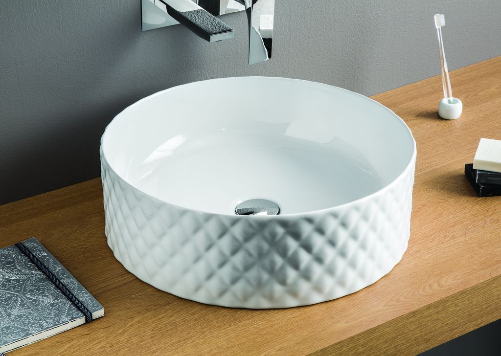 Nei modelli Rombo e Millerighe, dalla texture a rilievo, la ceramica è arricchita nelle versioni in oro e platino che avvolgono la superficie ceramica del lavabo come tessuti preziosi. Un oro declinato su forme minimal, presentato in contesti raffinati, dove gli oggetti e gli arredi diventano punto focale e non ridondanza barocca.Per bagni sontuosi ed eleganti, caldi e rigorosi nello stesso tempo. Cognac e Ghost sono invece due lavabi da appoggio in ceramica dal design essenziale e bordo fine sviluppati in più misure.