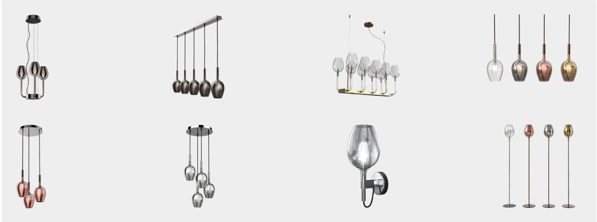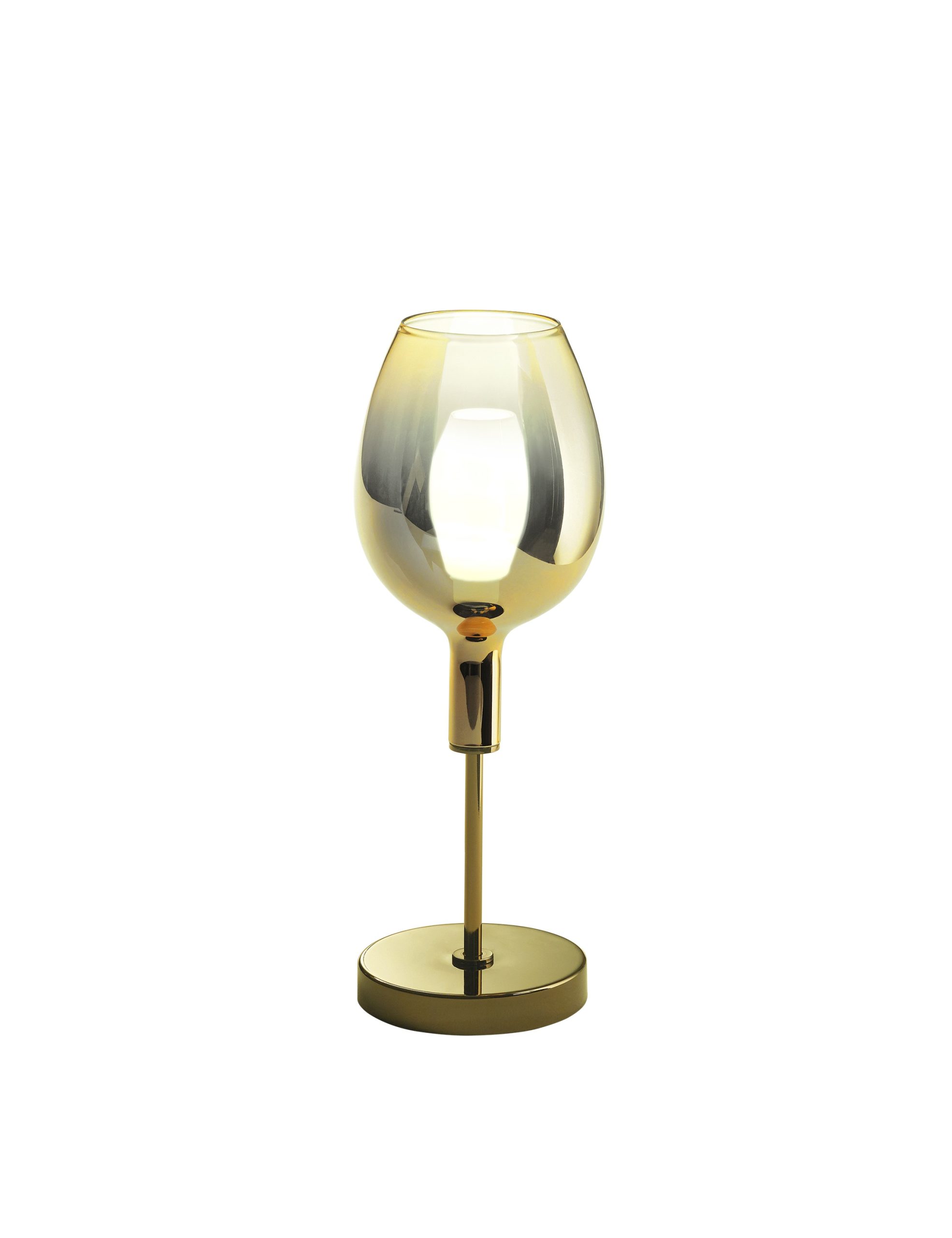 Il designer Danilo De Rossi si è ispirato alla classica silhouette del calice da vino, reinterpretata in modo insolito sotto forma di lampada con originali tonalità metalliche. Il diffusore è realizzato in vetro soffiato metallizzato, con un effetto cromatico specchiato e lucente , mentre lo stelo e la base circolare sono in metallo con finitura canna da fucile.