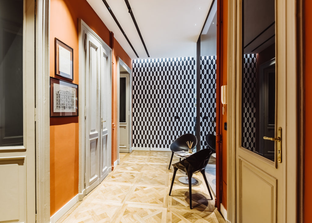 L’intervento di ristrutturazione degli spazi ha una duplice valenza: da un lato, vuole valorizzare gli elementi caratteristici dell’architettura dei primi anni del ‘900 (dagli importanti infissi con cornice decorativa ai soffitti con motivi d’epoca), dall’altro raccontare l’anima e la storia dello studio, per esempio nelle pareti e in alcuni dettagli d’arredo di un deciso colore arancio terracotta, che riprende il logo, nei prestigiosi abbinamenti materici, nelle collaborazioni consolidate con brand di primo piano, divenuti negli anni veri e propri partner di progetto.