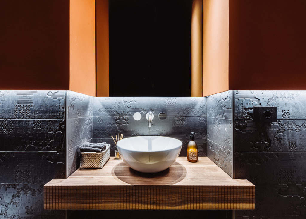 La stanza da bagno svela altre collaborazioni con prestigiose aziende di design. Qui il raffinato rivestimento Bas-Relief Patchwork di Mutina in versione black spicca nell’ambiente, in un forte contrasto con l’arancio delle pareti e il parquet di rovere a spina chevron, posato a 45 gradi, di Piccardi Living. Per i mobili, tutti su misura, disegnati da Italia and Partners, è stato scelto il noce canaletto.