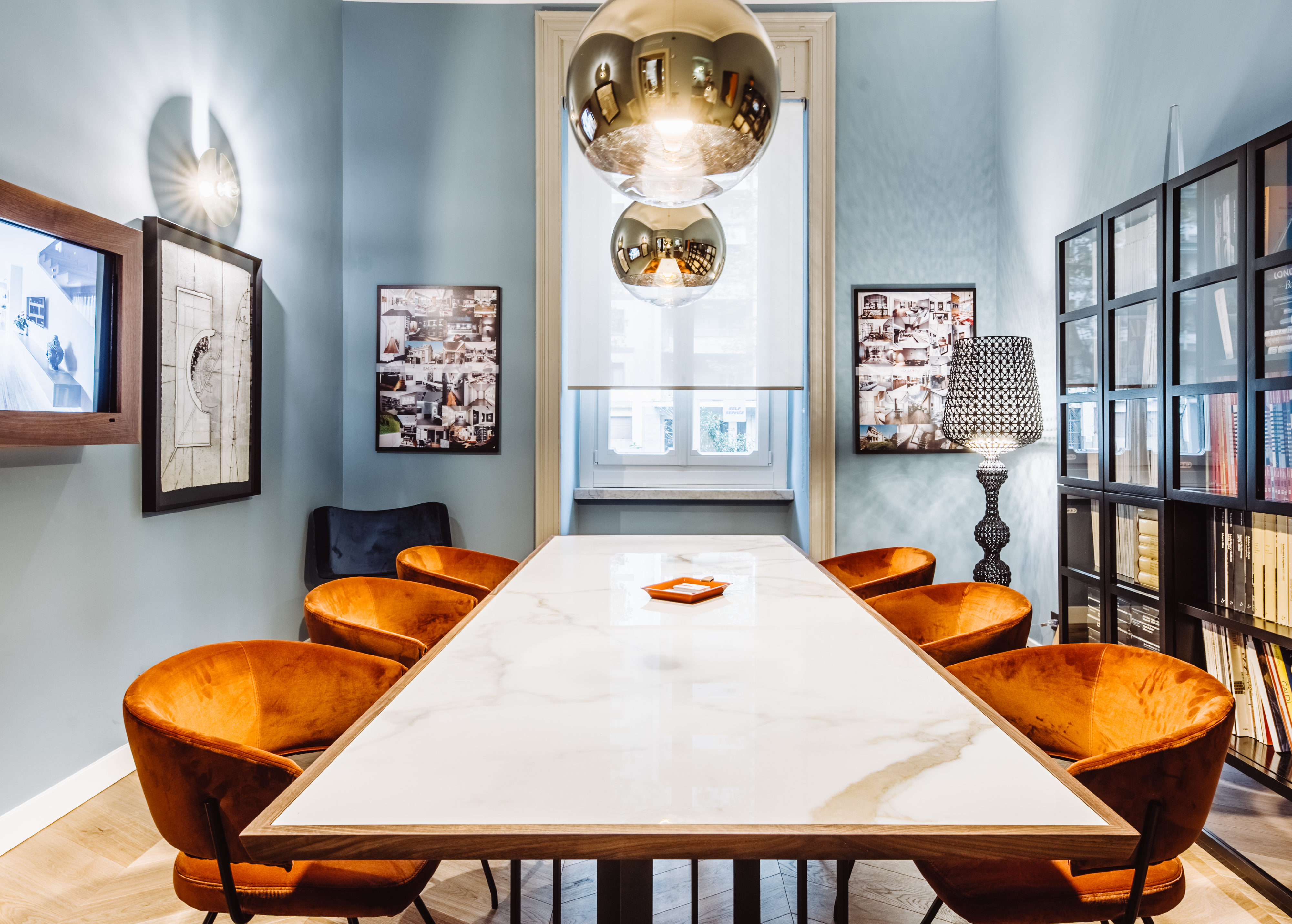 L’intervento di ristrutturazione degli spazi ha una duplice valenza: da un lato, vuole valorizzare gli elementi caratteristici dell’architettura dei primi anni del ‘900 (dagli importanti infissi con cornice decorativa ai soffitti con motivi d’epoca), dall’altro raccontare l’anima e la storia dello studio, per esempio nelle pareti e in alcuni dettagli d’arredo di un deciso colore arancio terracotta, che riprende il logo, nei prestigiosi abbinamenti materici, nelle collaborazioni consolidate con brand di primo piano, divenuti negli anni veri e propri partner di progetto.