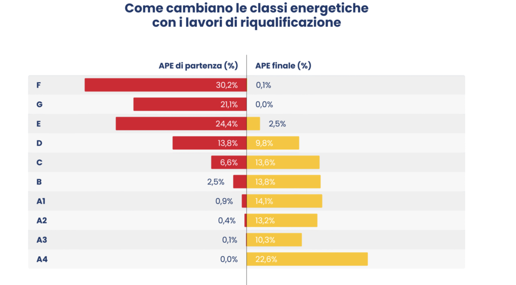 I dati mostrano un miglioramento medio di 4,5 classi energetiche a livello regionale, certificato dagli Attestati di Prestazione Energetica (APE). Prima degli interventi, quasi tre quarti degli edifici italiani (75,6%) si trovavano nelle classi più inefficienti (E, F e G), con la classe F che rappresentava il 30,2% del totale. Oggi oltre il 60% degli immobili rientra in una delle quattro sottocategorie della classe A, con il 22,6% in classe A4, la più performante.