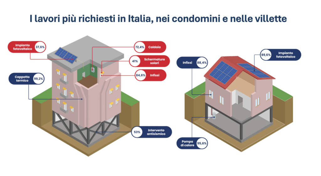 Tra gli interventi più diffusi nei cantieri italiani vi sono l’applicazione del cappotto termico (oltre il 96%), l’installazione di impianti fotovoltaici (53-55%) e interventi antisismici (48,3%), mentre negli appartamenti i principali lavori riguardano la sostituzione di infissi (84,6%) e caldaia (72,4%), installazione di schermature solari (41%) e impianti fotovoltaici (37,6%).